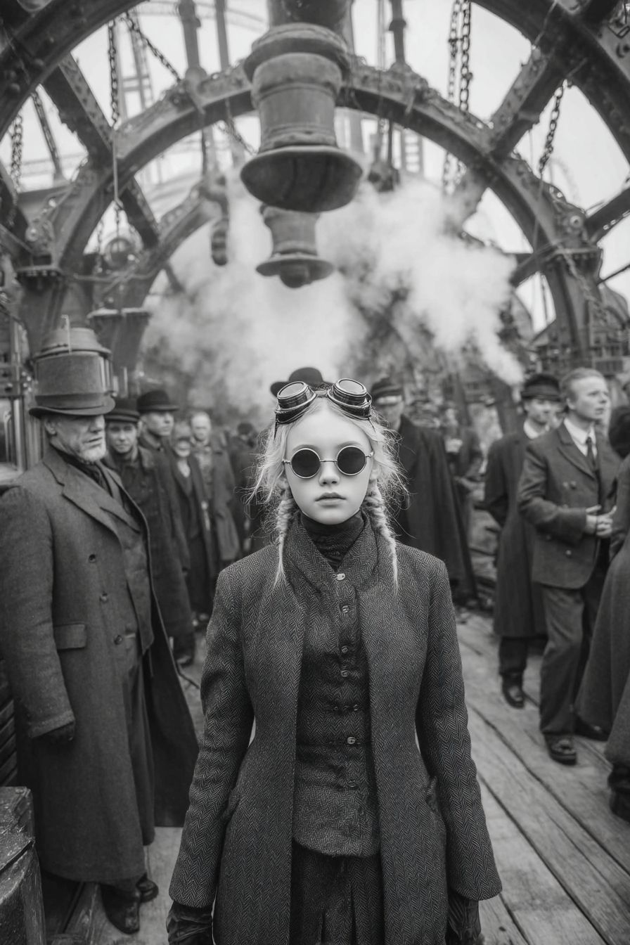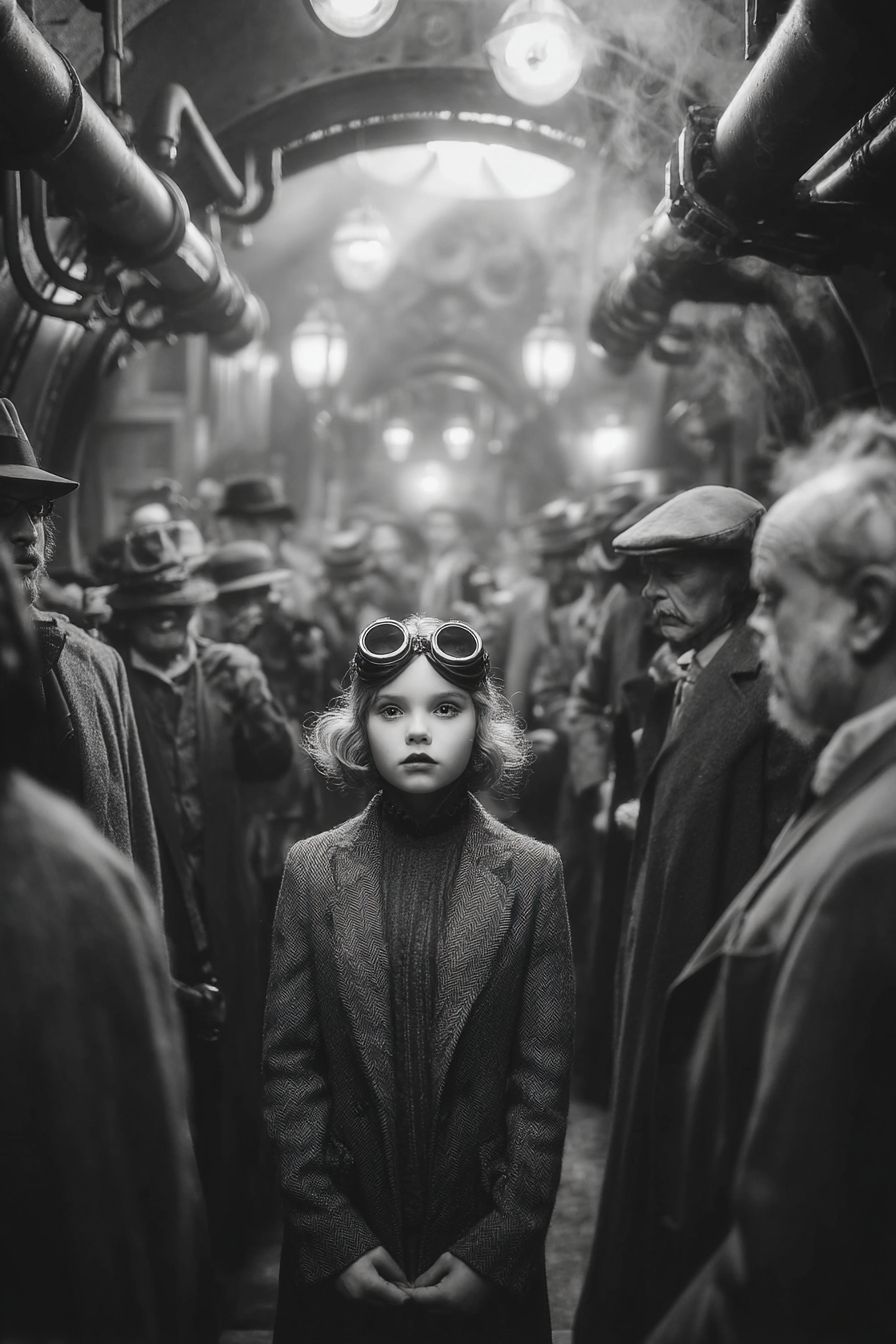 Fotografia em preto e branco. Uma imagem cinematográfica de uma comédia de aventura do ano 2056, apresentando uma menininha loira com óculos, vestida com trajes da era vitoriana em estilo steampunk, parada em uma ponte futurista steampunk através de uma estação de trem lotada de pessoas vestindo vários estilos e trajes. Tubos de vapor e equipamentos fumegantes cercam a cena, e a menina está olhando diretamente para a câmera. A gradação de cores dá à imagem uma sensação cinematográfica.