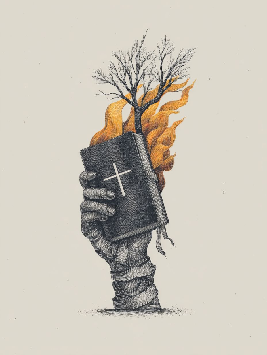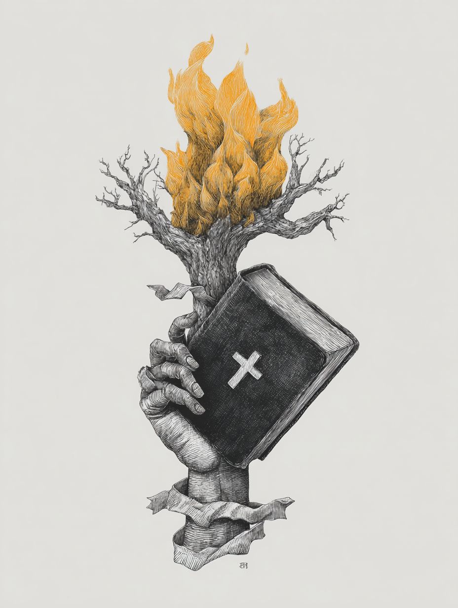 Uma ilustração altamente detalhada em estilo lápis preto e branco de uma mão humana realista envolta em fitas rasgadas estilizadas, segurando uma Bíblia preta fechada com uma cruz branca na capa. Desenhada com fine hatching e sombreamento, do topo da Bíblia cresce uma árvore seca e sem folhas, fundindo-se em chamas estilizadas laranja e amarelas, simbolizando a sarça ardente. Apenas as chamas estão coloridas, todo o resto está em escala de cinza, centrada em um fundo branco limpo, sem texto, projetada para impressão em camiseta.