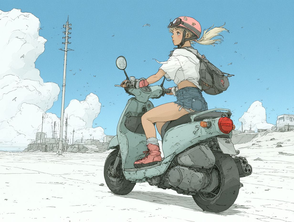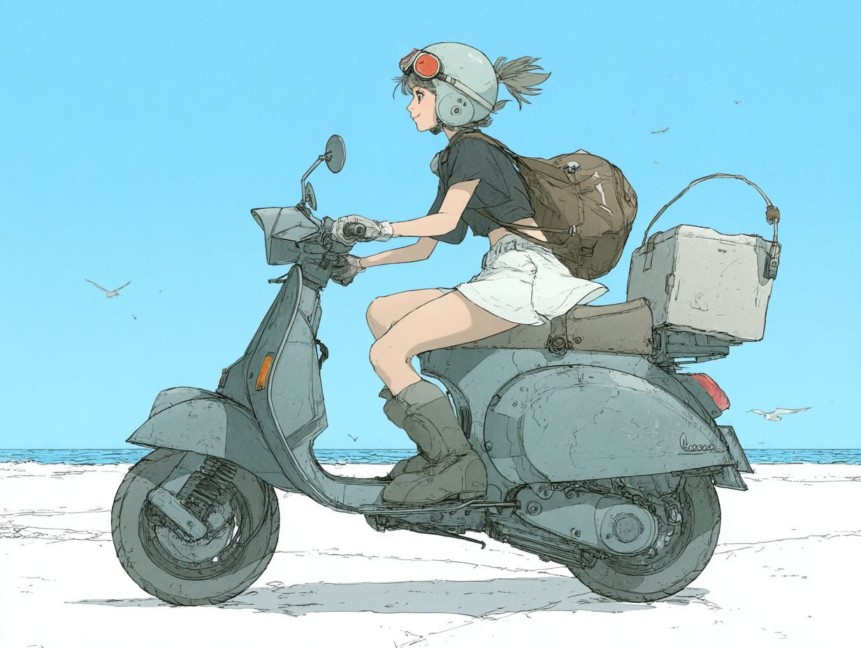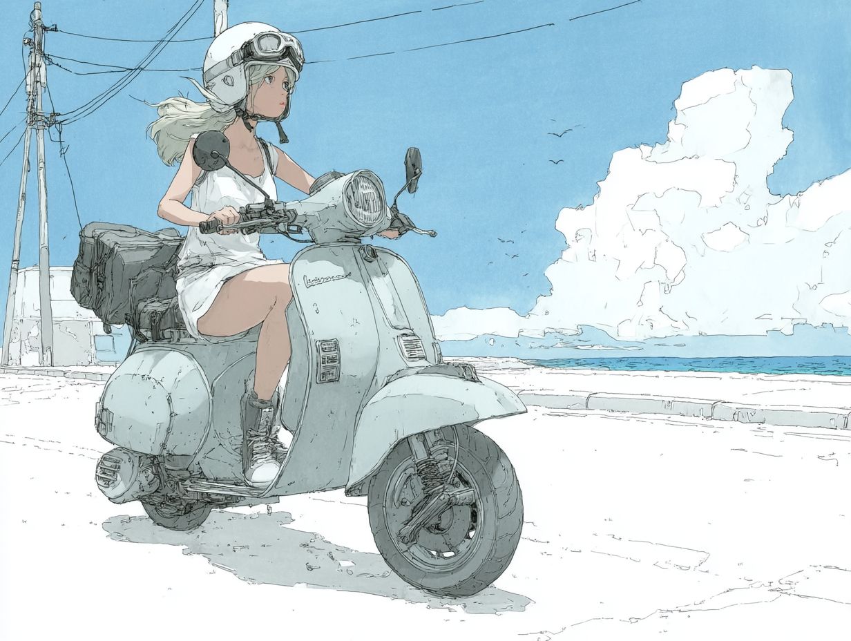 full body long shot, flat illustration, line art style, Asian Girl in miniskirt, riding a Scooter motorcycle on a road along with beach , --chaos 1 --ar 4:3 --sref 4212115738::1 800035::0.4 3058186947::0.7 --sv 4 --v 7.0 --s 250