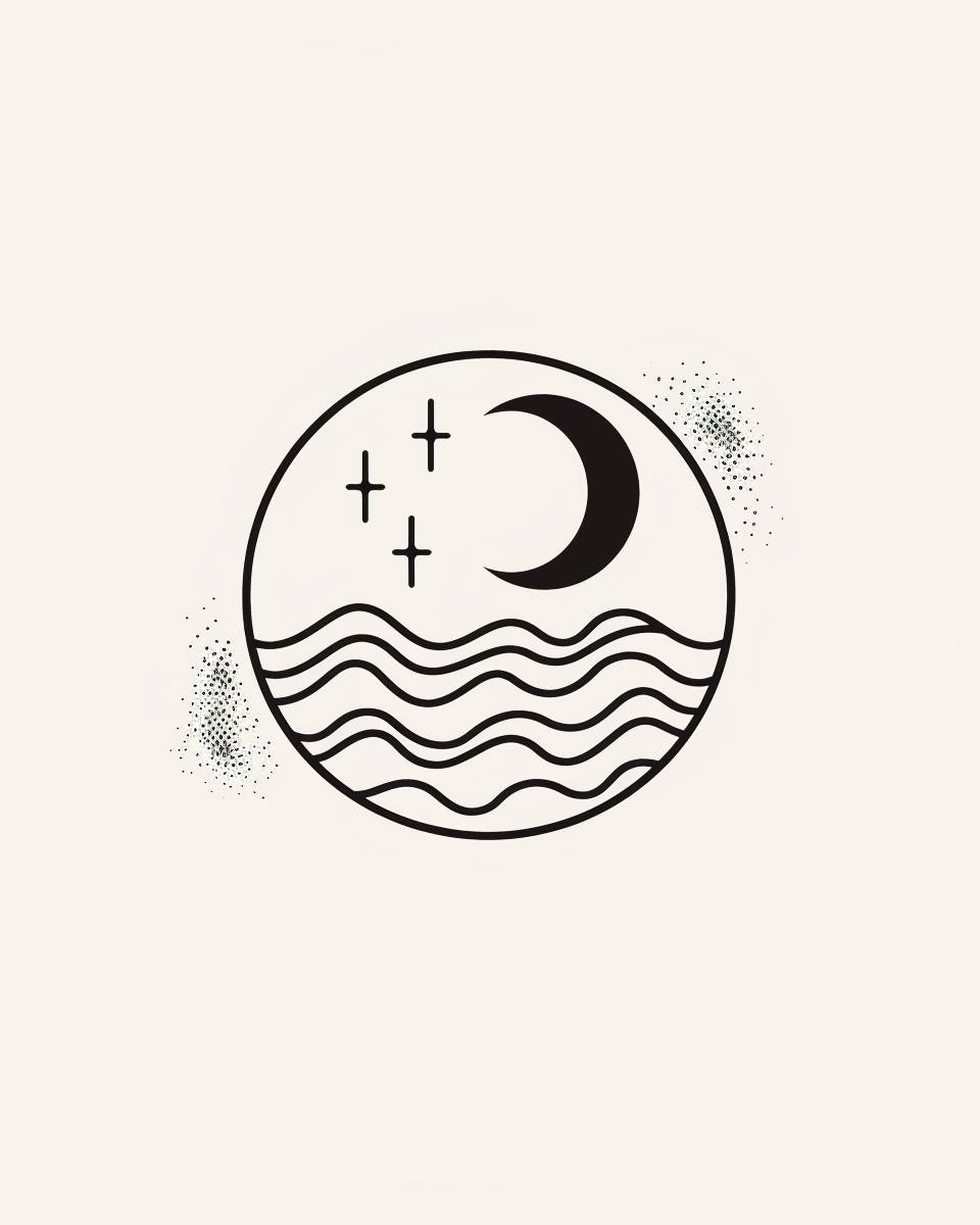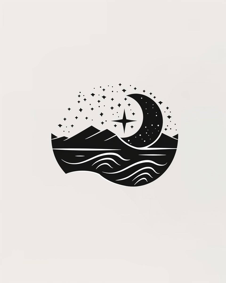 A logo, white background, simple black lines drawing the moon and lake circle, dotted with stars. Sound wave lines, healing feeling, simple shape style, simple shape --ar 35:44 --v 6.0