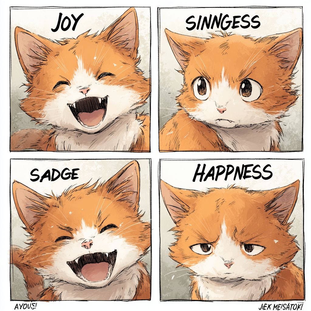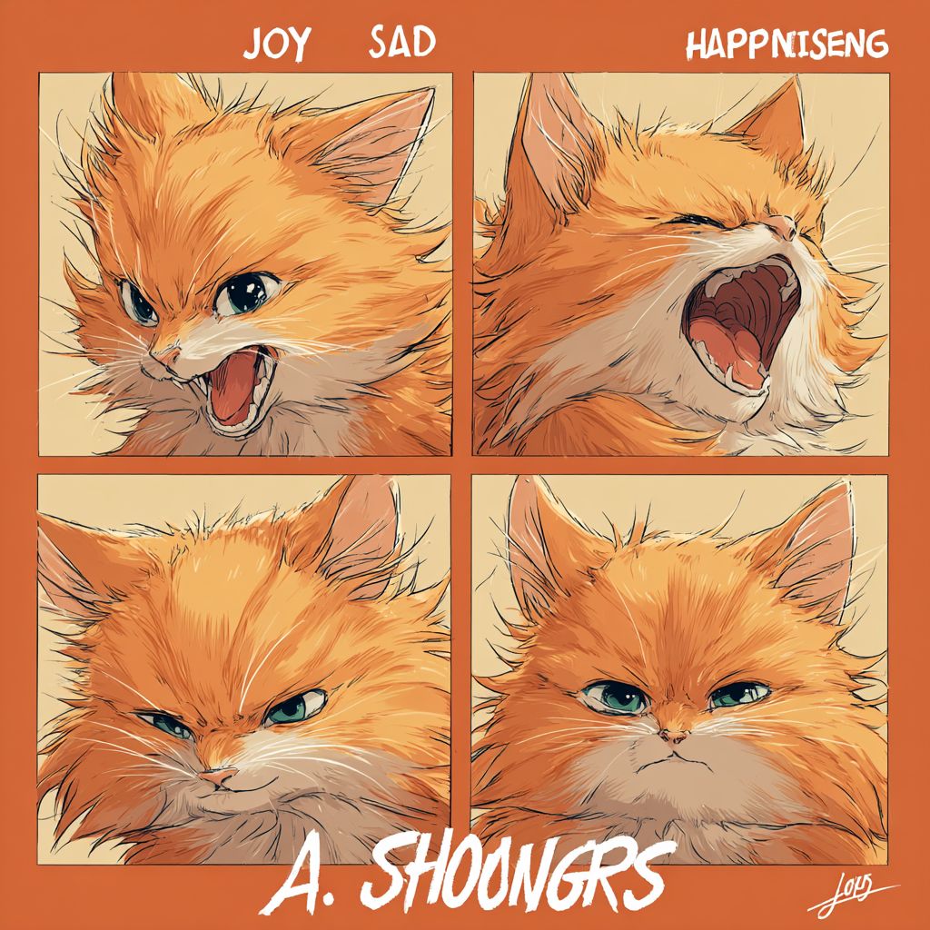 Um gato laranja mostrando expressões de alegria, raiva, tristeza e felicidade