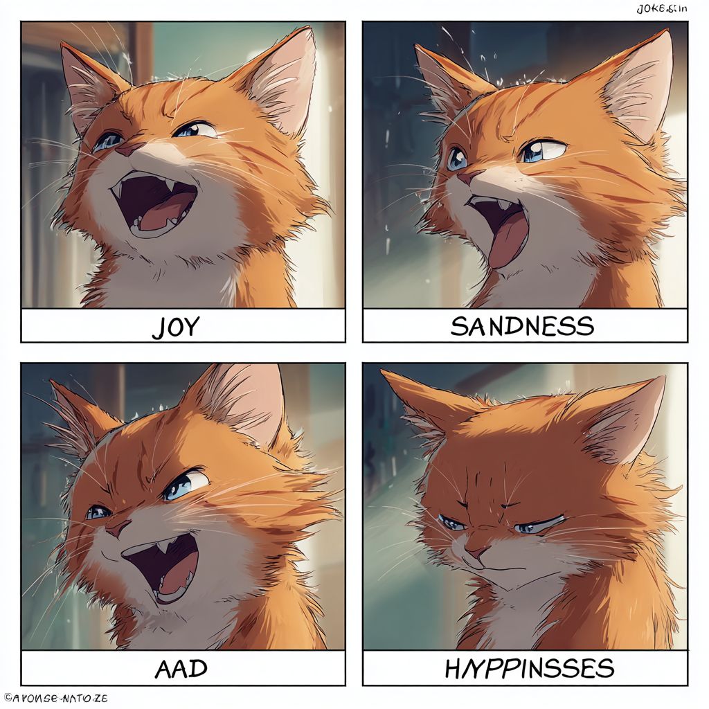 Meme: Shinkai Makoto style, 4-panel image, orange cat, showcasing four expressions of joy, anger, sadness, and happiness. In the top left corner of each panel, write "Joy," "Anger," "Sadness," and "Happiness" respectively. --v 7.0