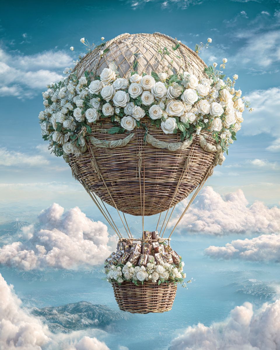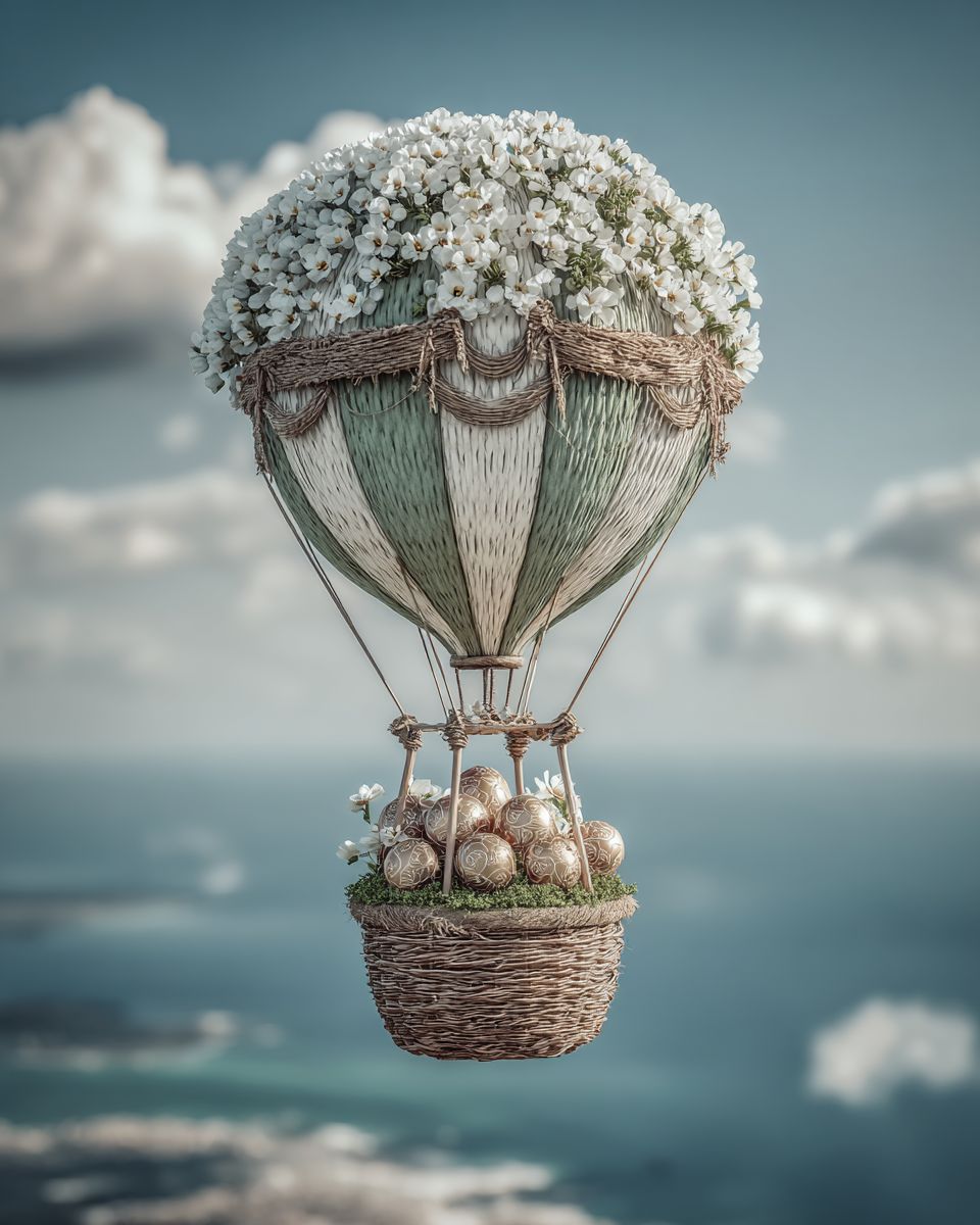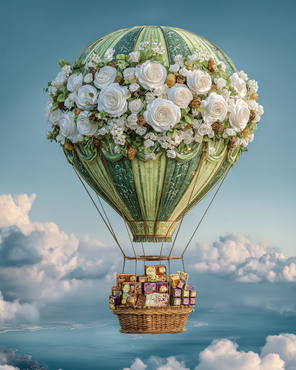 A hot air balloon i with white flowers, carrying baskets full of chocolate wrapped , flying over sea level with blue sky and light clouds, beautiful scenery, professional photography, high resolution, very detailed, realistic, real photo, ultra-realistic, sharp focus, highly intricate details, hyper-detailed, beautifully color graded --ar 4:5 --exp 40 --stylize 20 --v 7.0