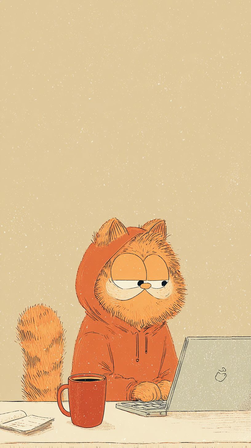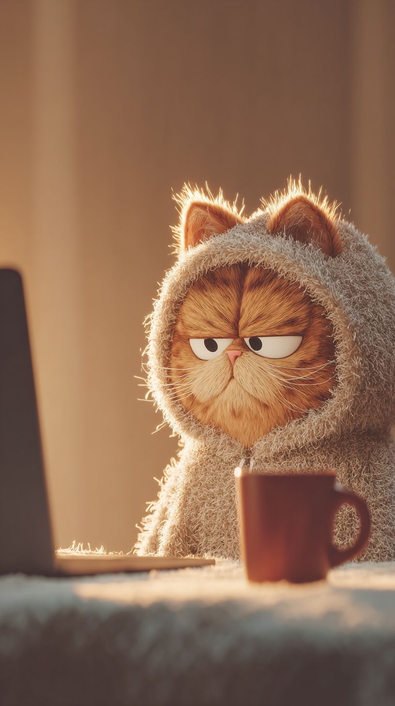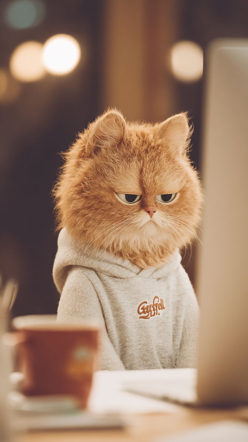 Garfield wearing hoodie working on a PC with a grumpy face. Red coffee mug on the table beside the PC. --ar 9:16 --stylize 250 --v 7.0 --p o3iqr93