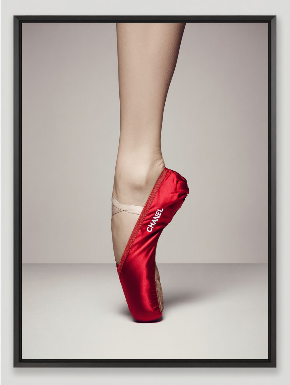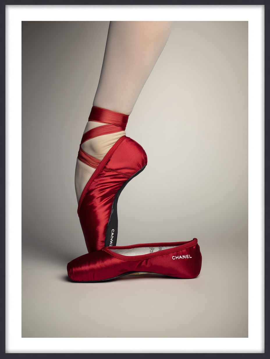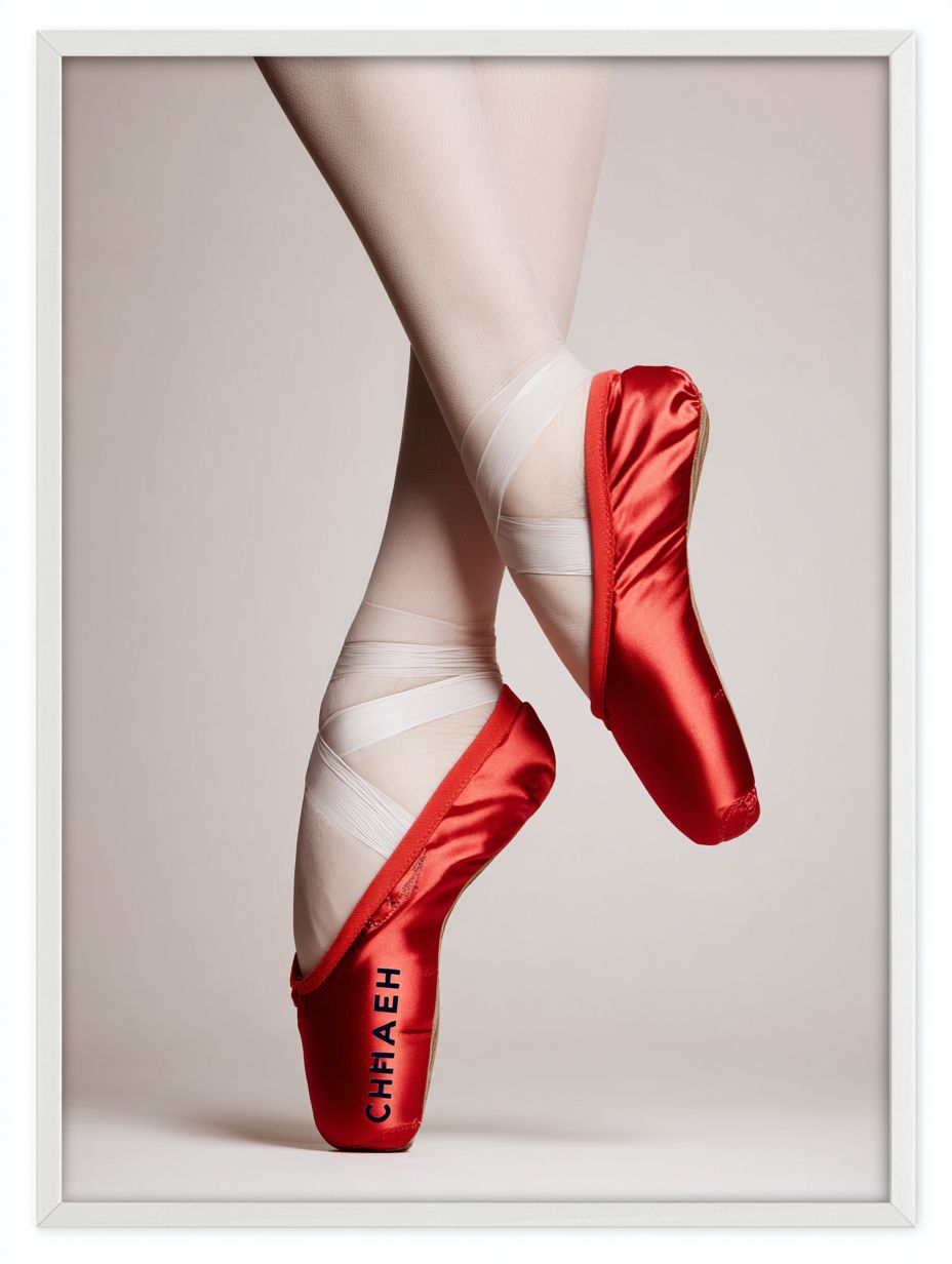 framed image of a red satin ballerina shoe in en pointe position, the second shoe flat on the ground, focus on the pointed shoe, elegant woman's legs cropped at the chin, no face visible, studio lighting, neutral background, high-fashion editorial style, on the side of the en pointe shoe the word CHANEL clearly written in black using the original CHANEL font, luxury craftsmanship detail, the shoe satin texture should show fine stitching and realistic fabric sheen, no extra text, photorealistic, timeless composition, suitable for gallery framing --chaos 5 --ar 3:4 --raw --profile thhv8nh --stylize 0 --v 7.0