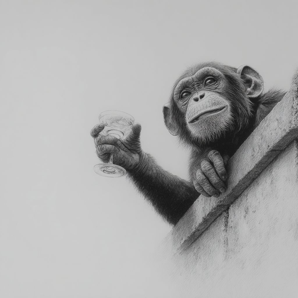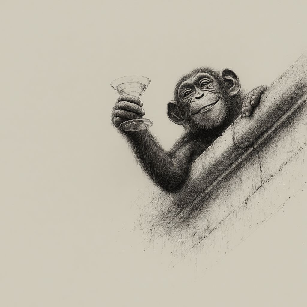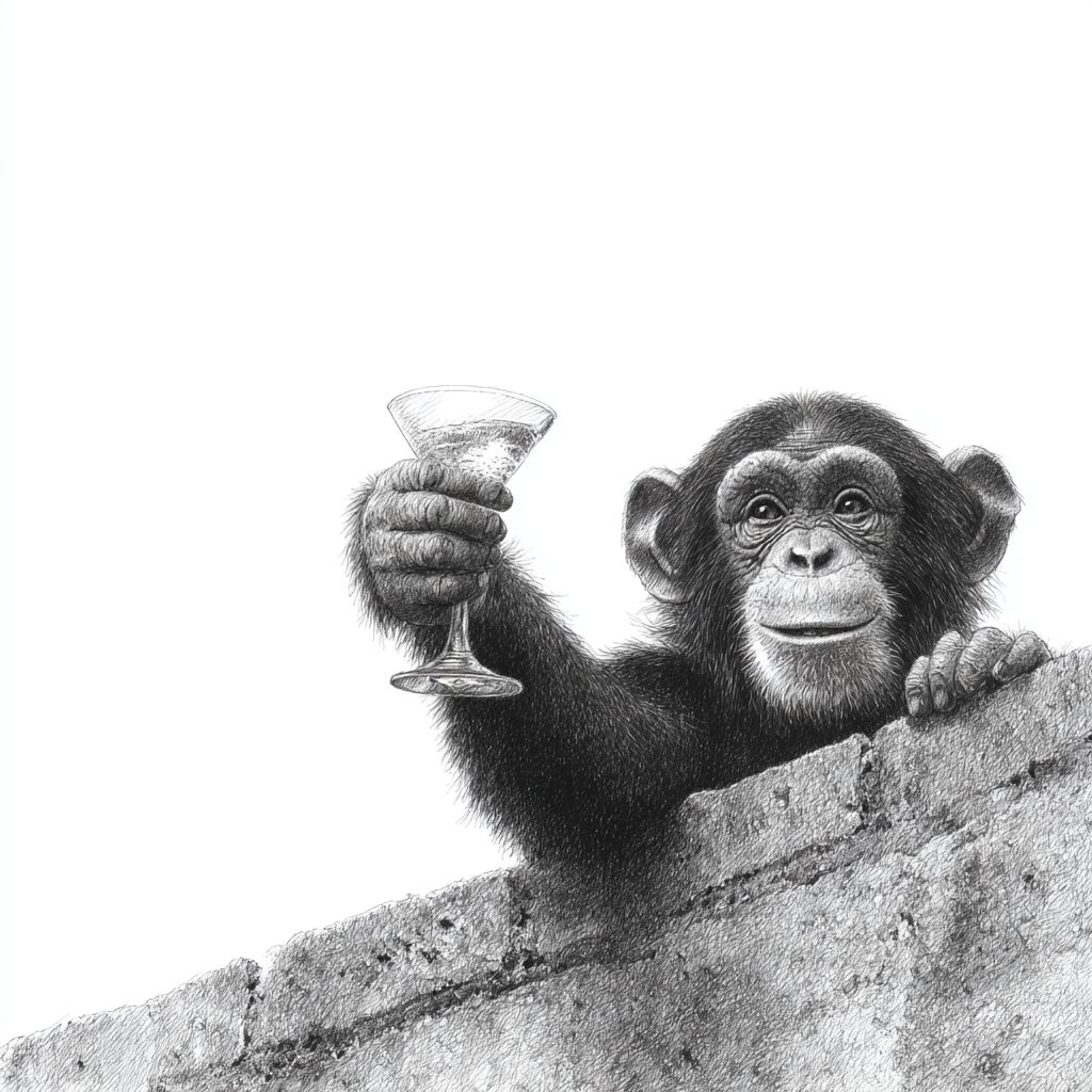 a single adult chimpanzee, leaning out from the top of a wall, he is smiling, holding a martini glass, raising up his martini glass, he is happy, celebrating, clean background, pencil drawing, draft, super detailed, 64K, HDR --profile 1ei233a --v 7.0