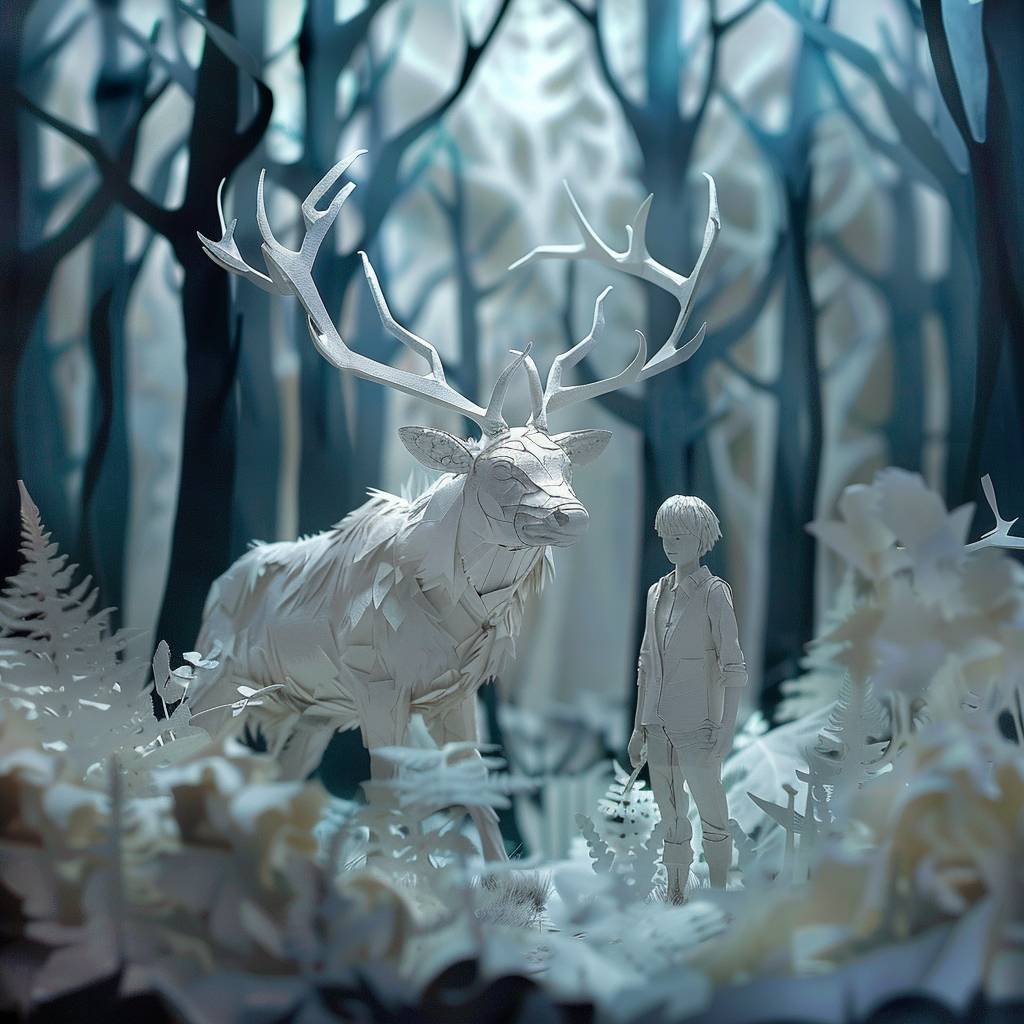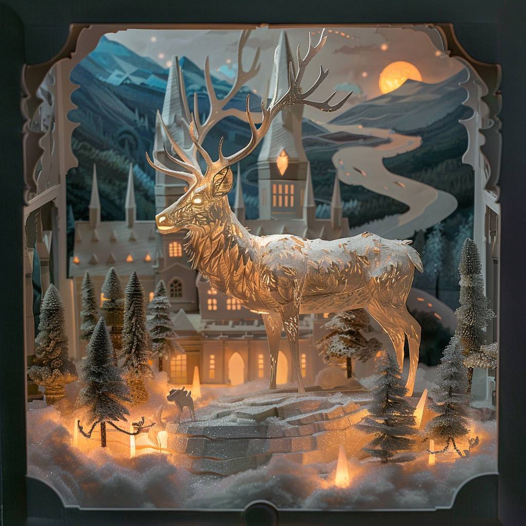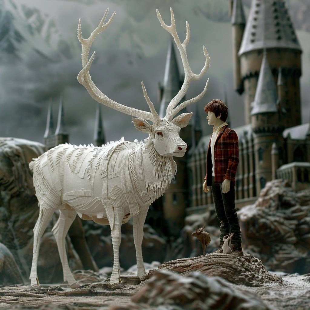 Harry Potter e um veado branco, artesanato em papel em camadas, diorama.