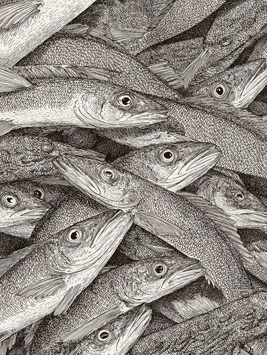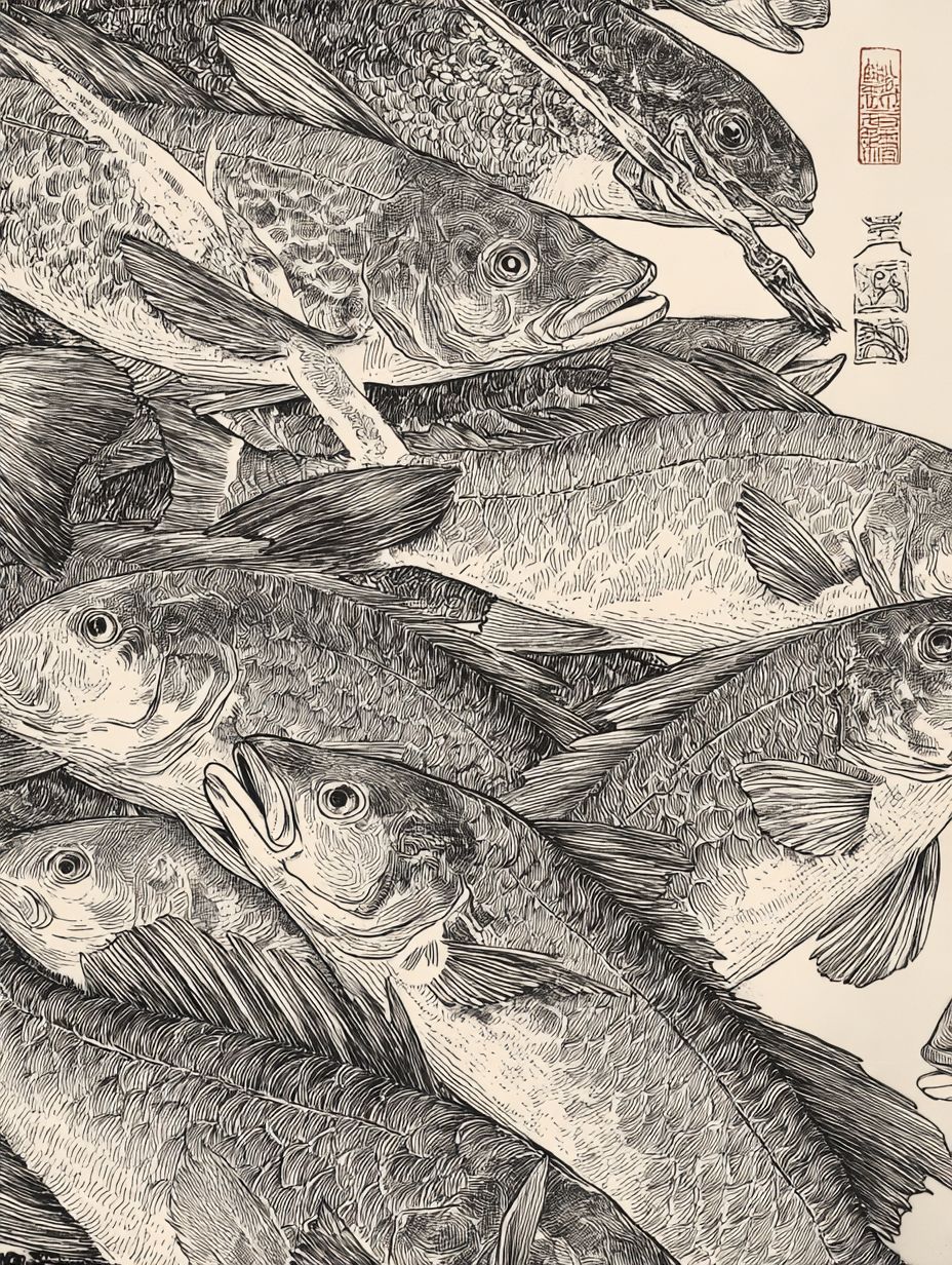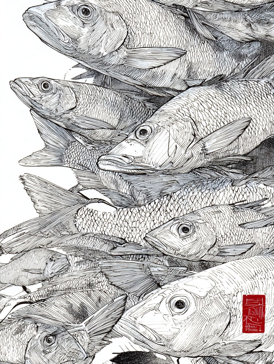 Desenho em tinta preta e branca de muitos bagres de cabeça plana (Mugil cephalus) no estilo de Katsuya Terada. A obra apresenta traços grossos e é altamente detalhada, com acentos usando caneta de tinta chinesa, pincel de tinta chinesa e algumas áreas sólidas em preto.