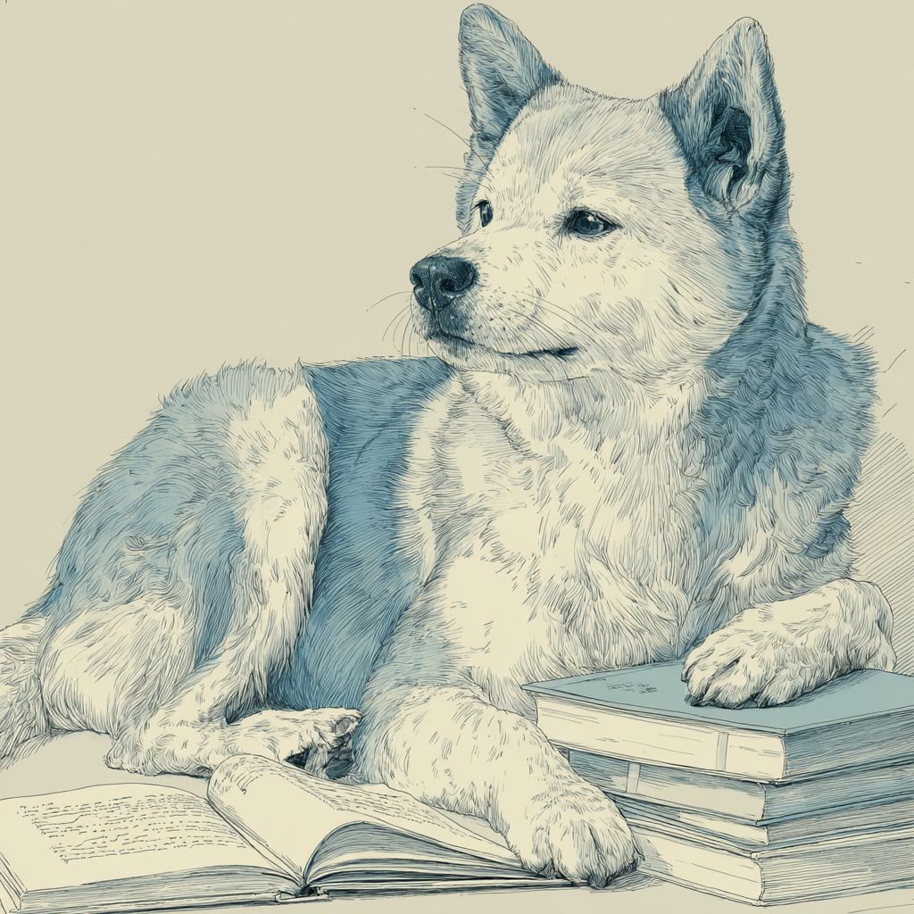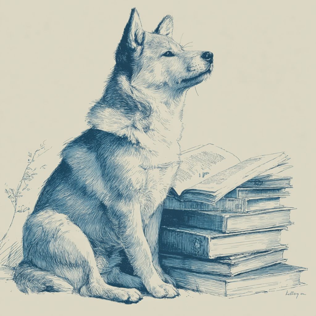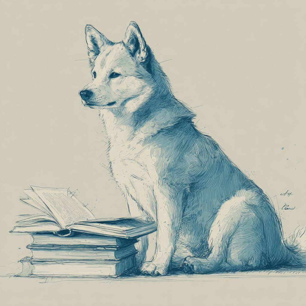 Um desenho simples de linha de um cachorro pequeno, seja Shiba Inu ou Labrador, sentado de costas para o espectador, olhando para um livro aberto empilhado sobre uma pilha de livros. O cachorro deve ter orelhas caídas ou uma leve curvatura na cauda. Sem detalhes faciais. Somente linhas limpas. Use tons neutros suaves de moda, como bege aveia (#D9CFC3), azul empoeirado (#A5B5C9) e marfim. Não incluir texto, fundo transparente, vetor.