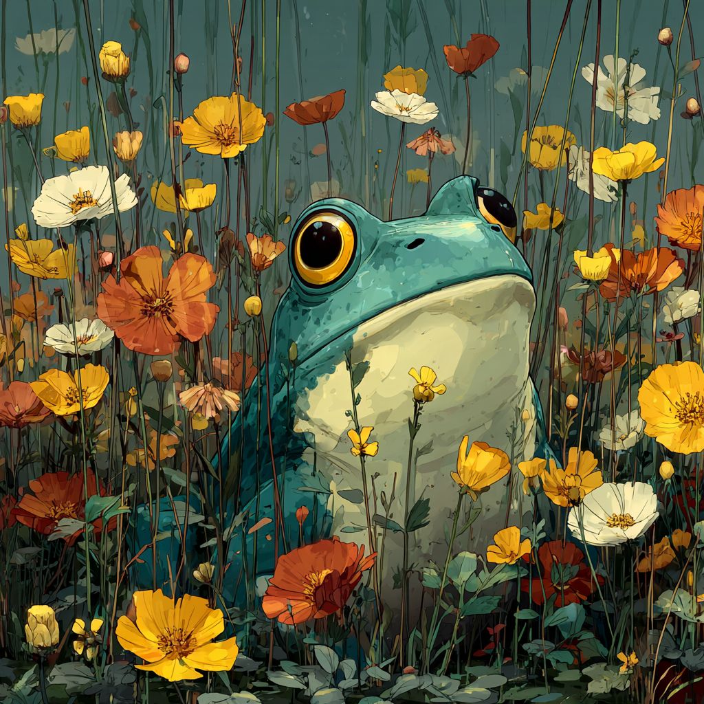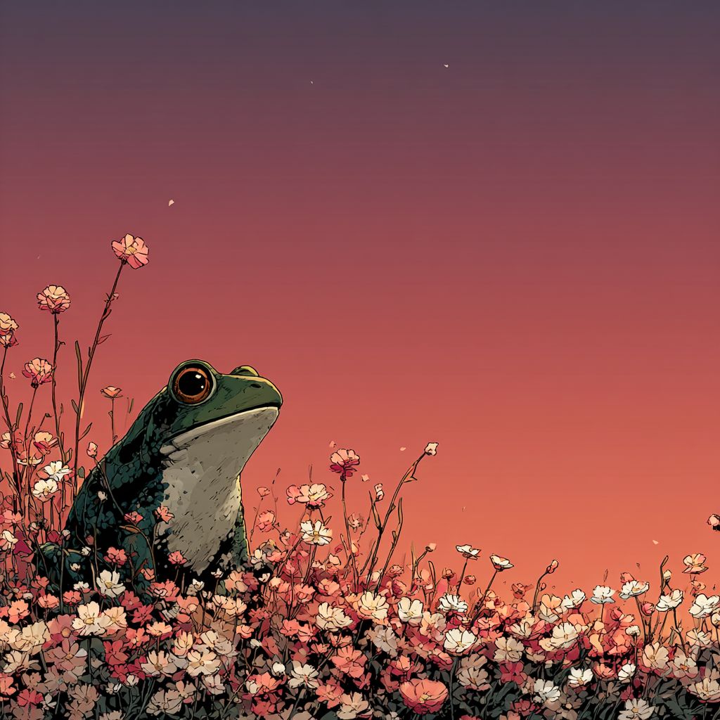 Cena fofa de um desenho animado de um sapo sentado em um campo de flores