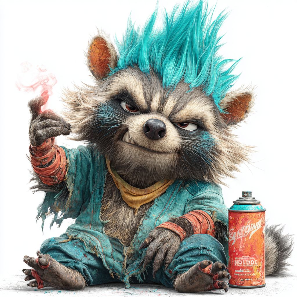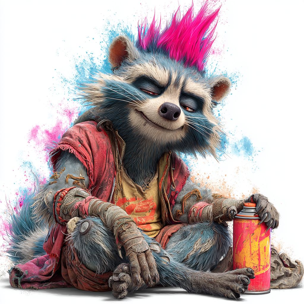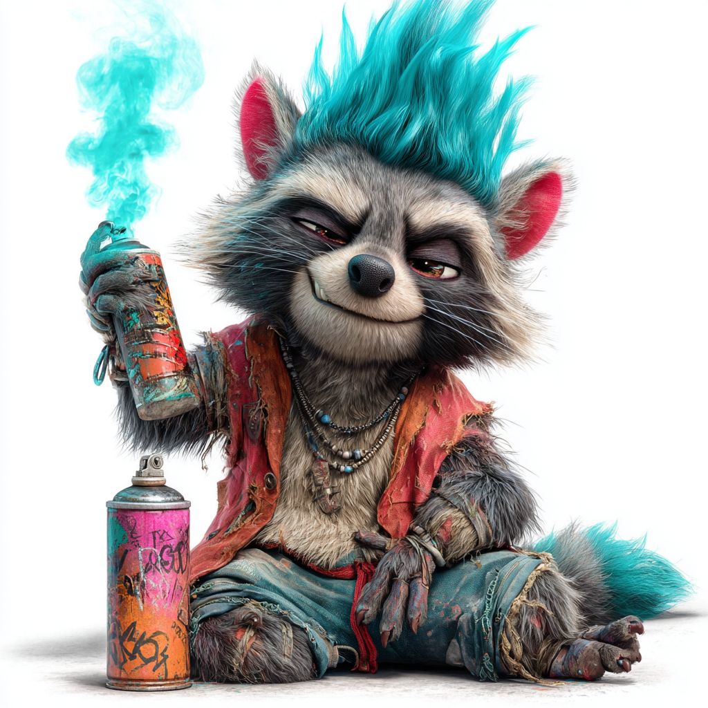 Um guaxinim de desenho animado com um moicano de néon sorrindo enquanto segura uma lata de spray brilhante