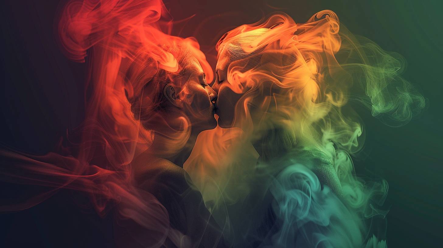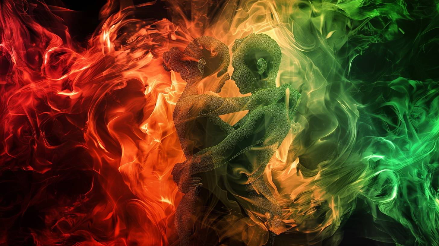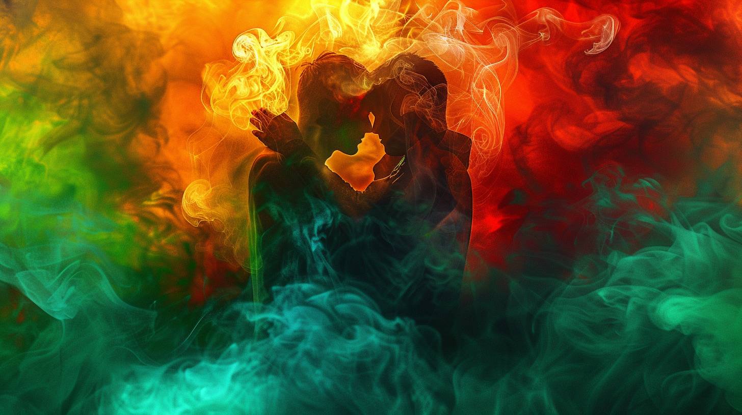 smoke made of red, orange and green colors forming two embracing people colorful, digital art style --ar 16:9 --v 6.0 --style raw