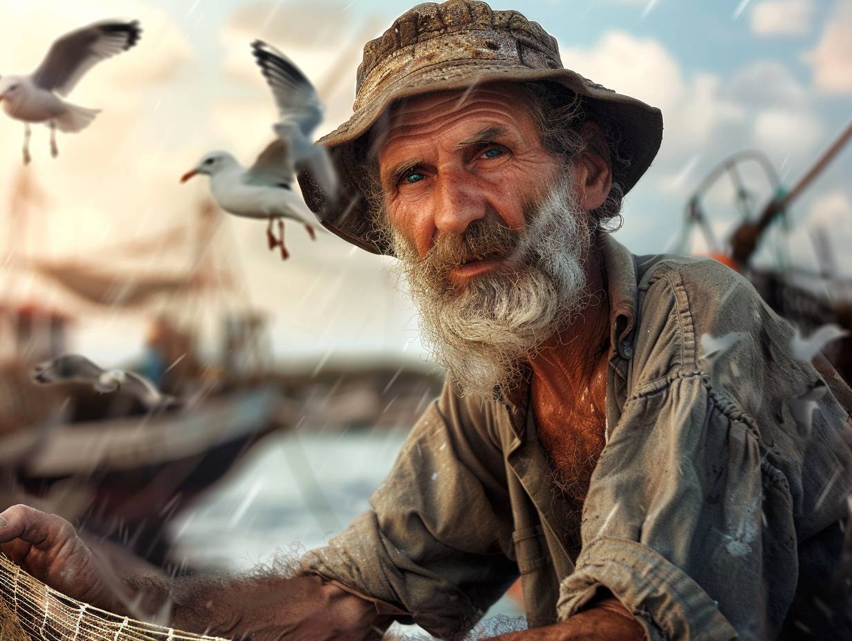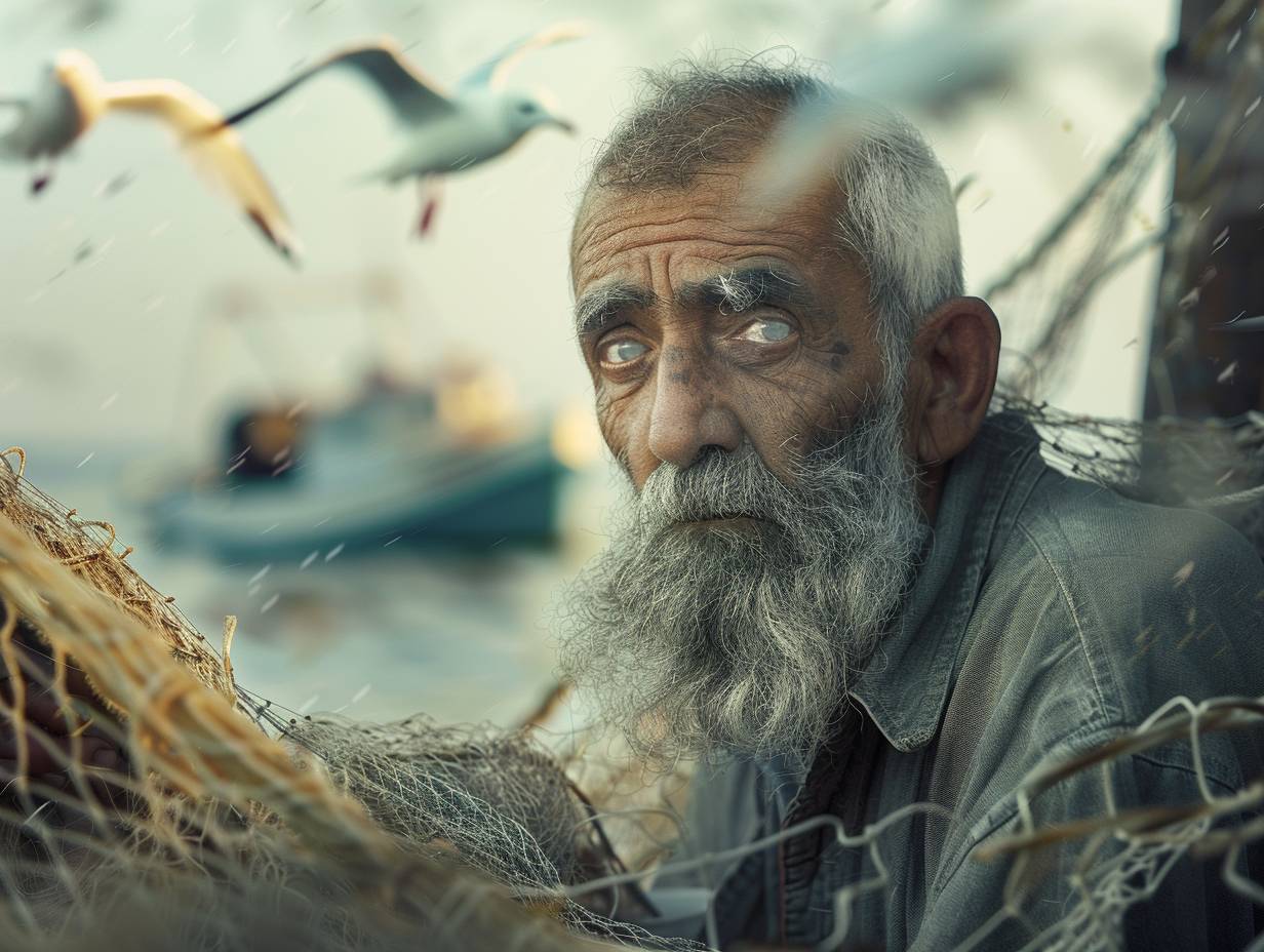 Bearded fisherman mending a net. Weathered skin. Steely eyes. Coastal village. Dawn. Fishing boats bobbing in the harbor. Medium shot, upper body. Soft lighting, seagulls circling overhead casting fleeting shadows. Realistic texture. --ar 4:3 --v 6.0