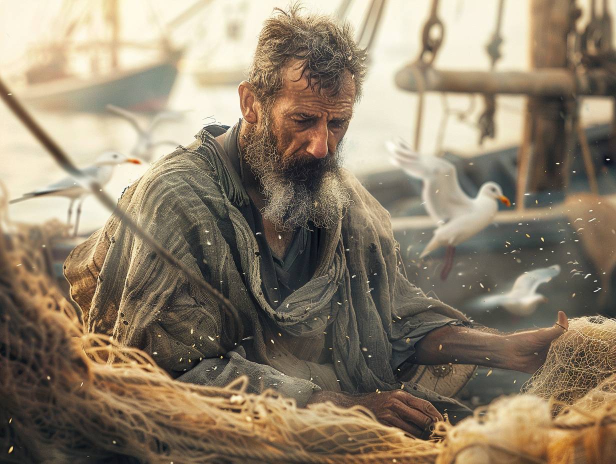 Um pescador de uma aldeia costeira conserta uma rede ao amanhecer, com pele curtida e olhos de aço, enquanto barcos de pesca balançam no porto e gaivotas circulam acima.