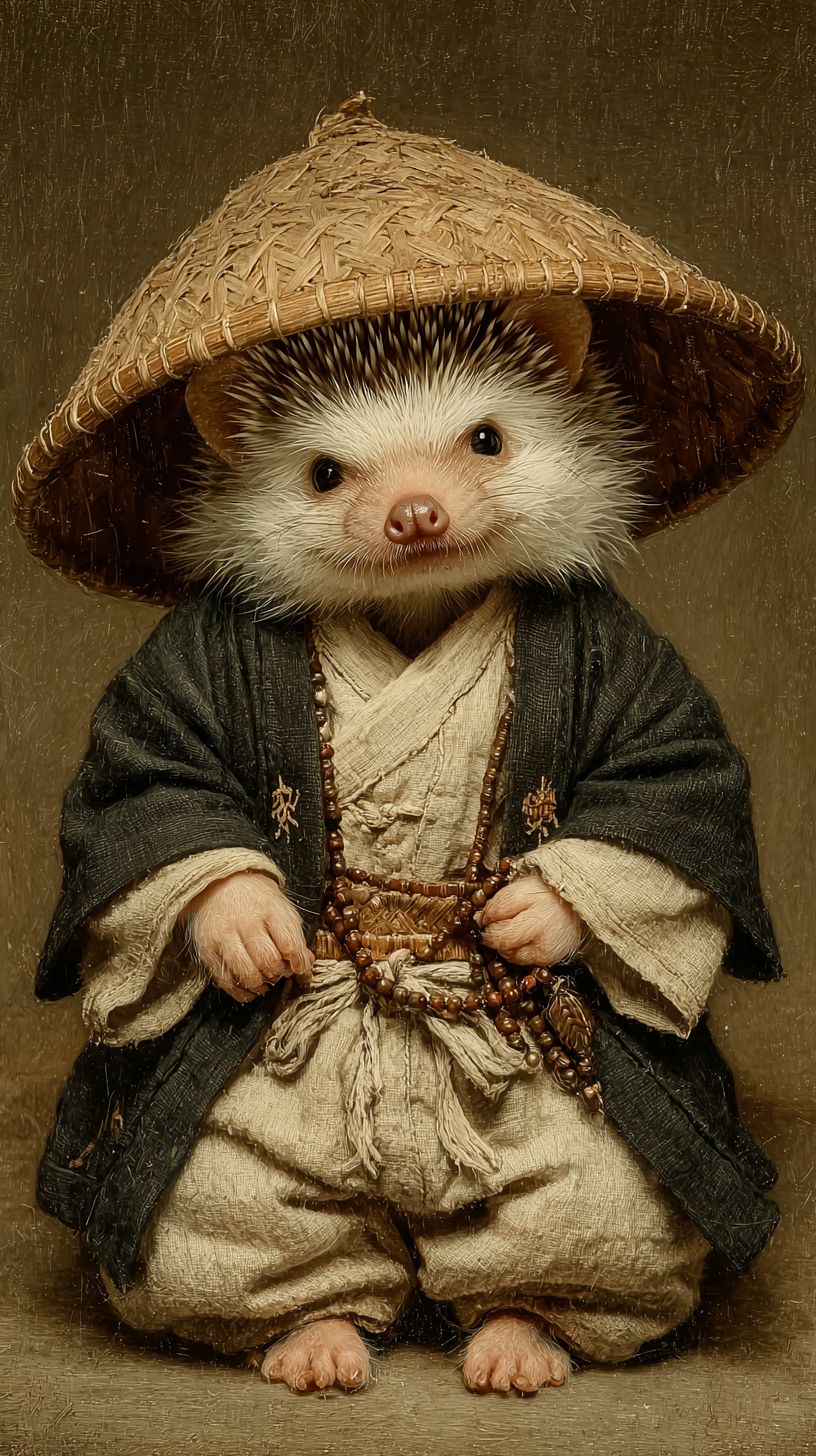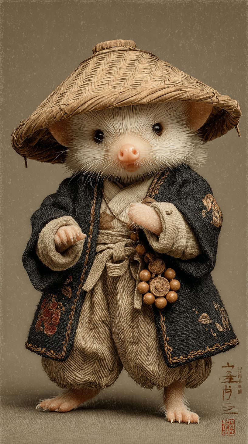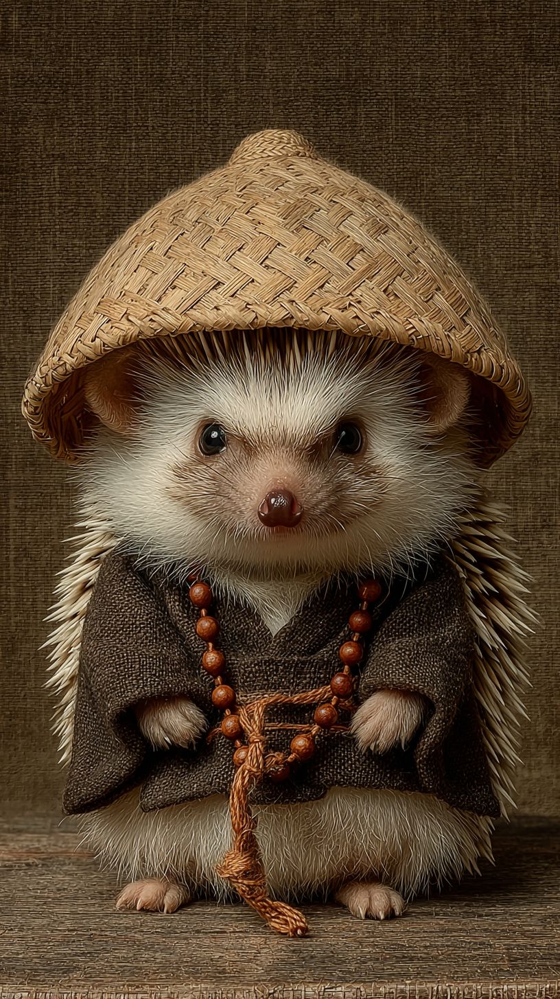 Fine brushwork, little hedgehog, front view, wearing a bamboo hat, full body close-up, sitting cross-legged, wearing monk's clothes, wearing a string of Buddhist beads, with hands folded, cute, ancient Chinese style, --ar 9:16 --s 750
