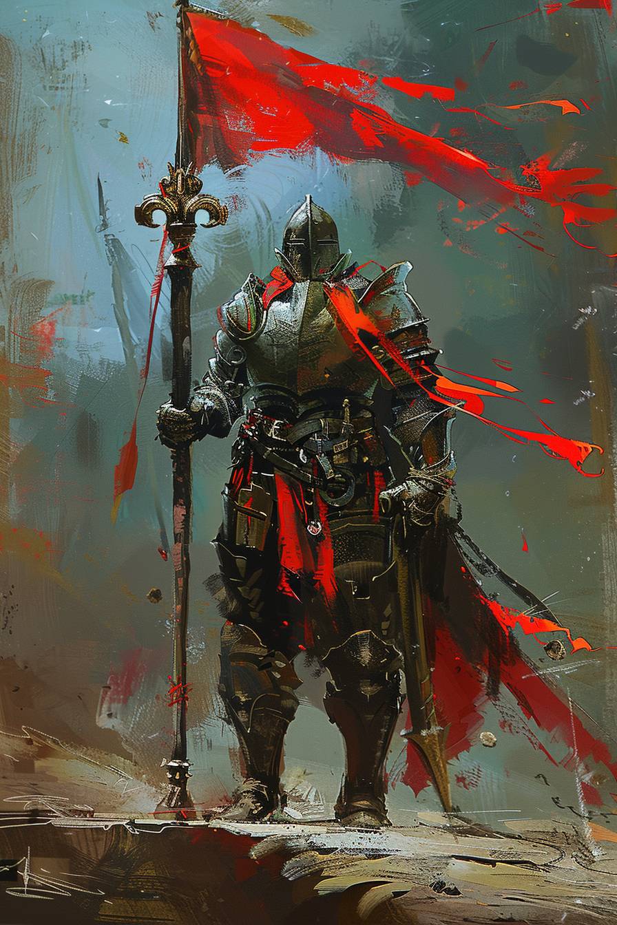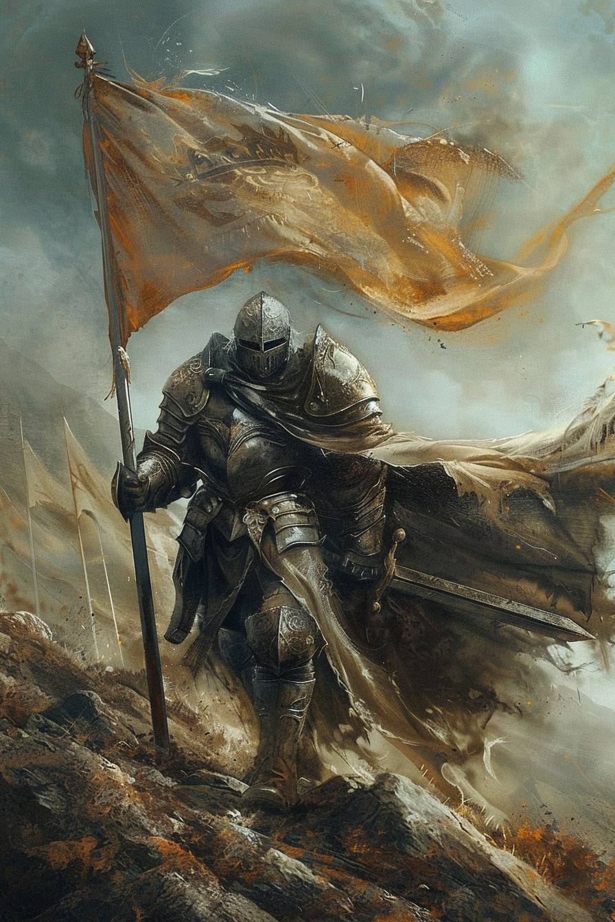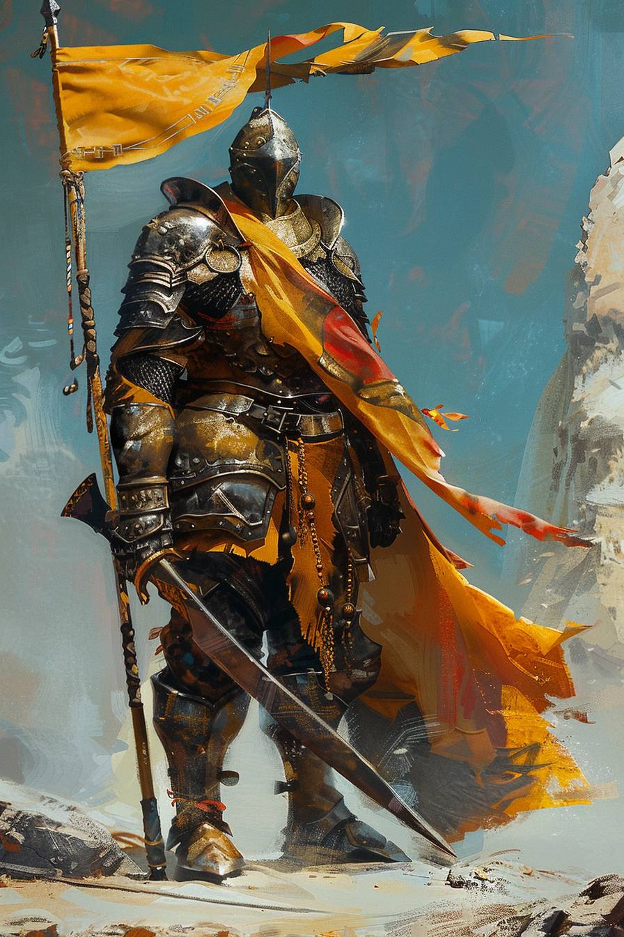 Guerreiro cavaleiro moderno com uma bandeira e uma lâmina gigante
