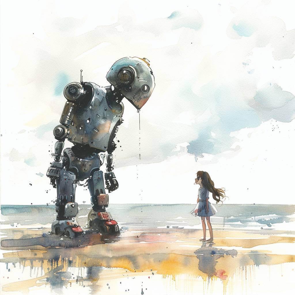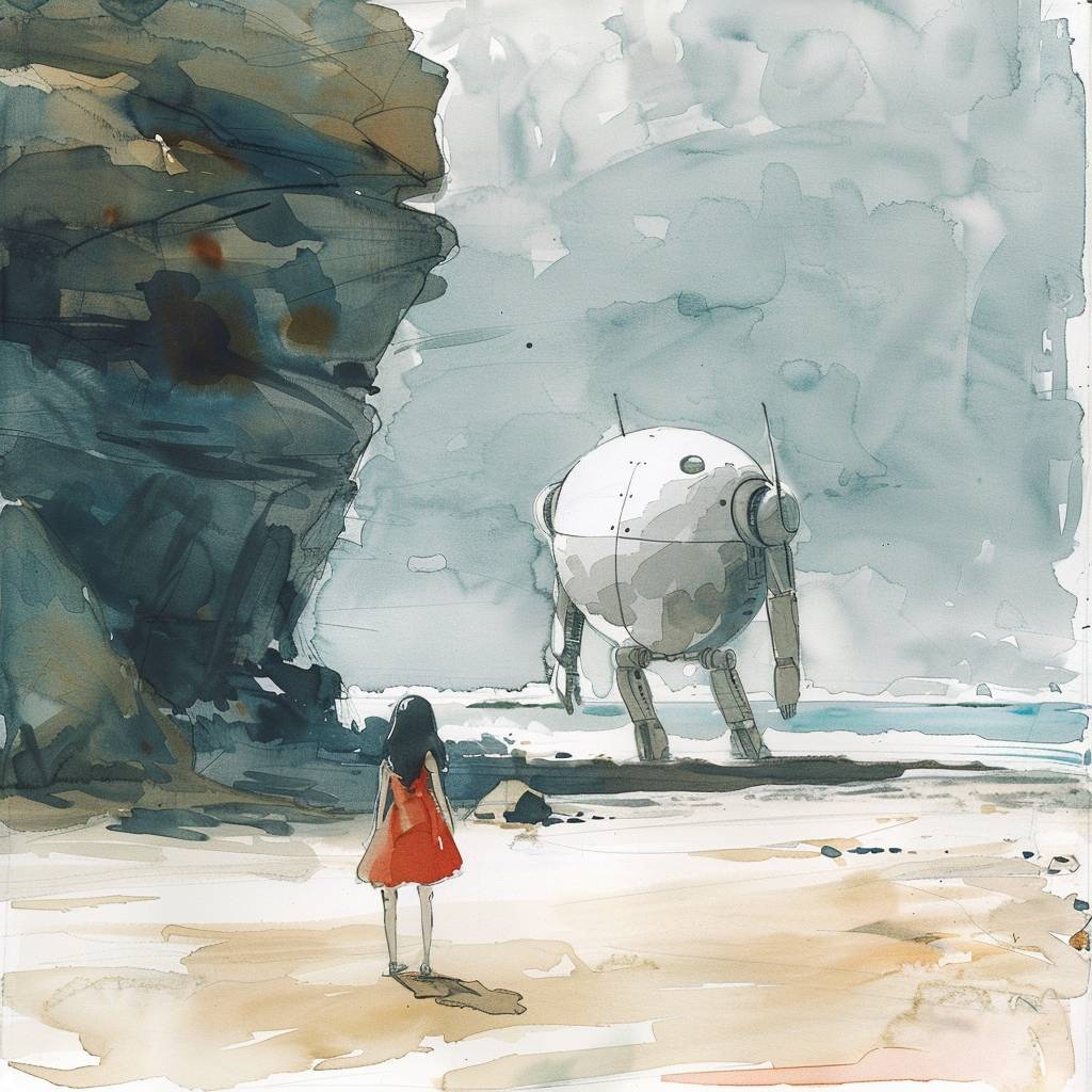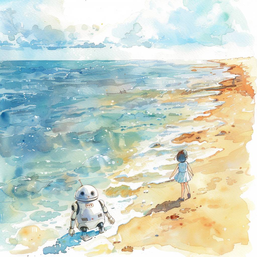 Uma pintura aquarela dos sonhos que retrata uma garota e um robô na praia com fundo branco e poucos detalhes, inspirada pelo Studio Ghibli.
