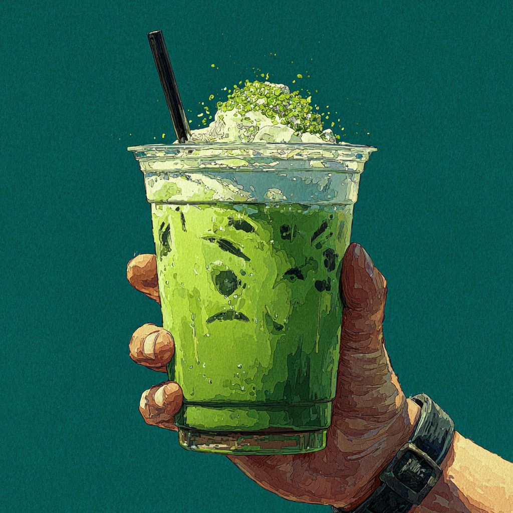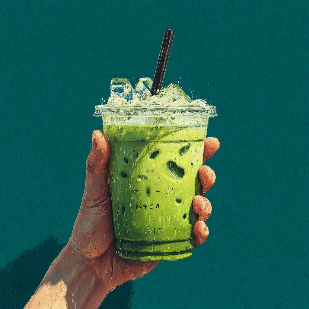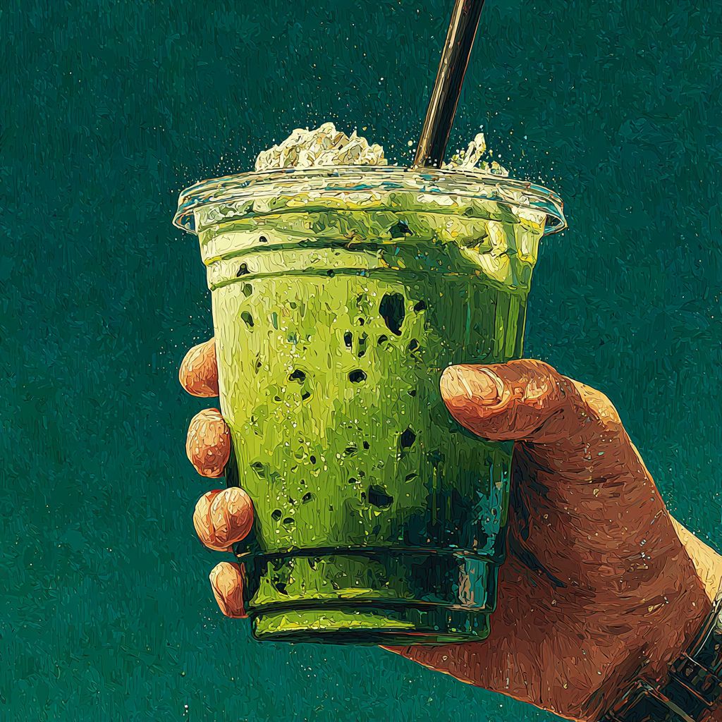 Uma ilustração em estilo semi-realista de um desenho animado de uma mão segurando um copo plástico transparente cheio de matcha gelado. A bebida possui uma cor verde vibrante e é coberta com uma camada natural e leve de espuma de matcha (não espessa ou cremosa). O copo está aberto sem tampa, e um longo canudo preto está inserido diretamente na bebida. A mão segura a borda superior do copo, assim como em um gesto casual de compras. O fundo é um rico verde escuro, criando uma atmosfera calma e terrosa em vez de um céu. O estilo deve combinar a estética realista e de cartoon, com sombreamento suave, realces sutis e leve condensação do lado de fora do copo para sugerir que a bebida está fria.