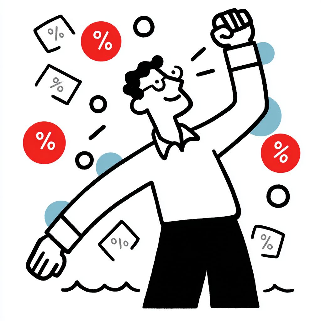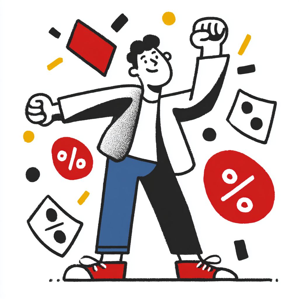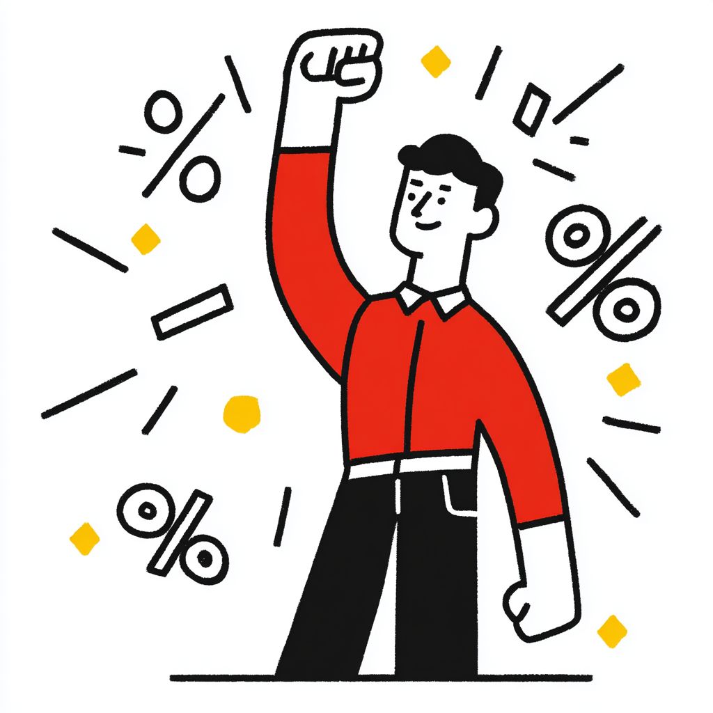 Um homem feliz olhando para cima, sorrindo e levantando o punho, cercado por números flutuantes e sinais de porcentagem