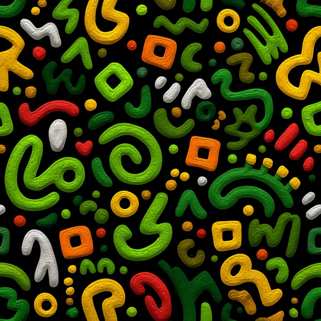Padrão colorido e sem emenda com fundo de grama, rabiscos multicoloridos brilhantes no estilo de ilustração de livros infantis, inspirado no desenho de contornos, formas vibrantes em verde limão, todas as linhas conectadas com pontos, quadrados e curvas, traços grossos e ousados, layout harmonioso e equilibrado, todos os elementos unificados em um ritmo lúdico, projetado em 2D com bordas limpas e nítidas, sem sombras, sem tons de cinza, dirigido por Steve Farber.