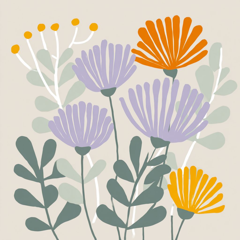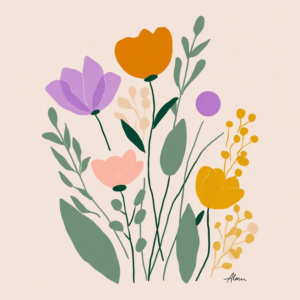 Ilustração ao estilo de Matisse, com formas e linhas simples, retratando flores em cores pastel de verde sálvia, roxo, laranja e amarelo.
