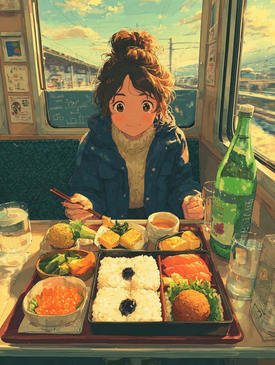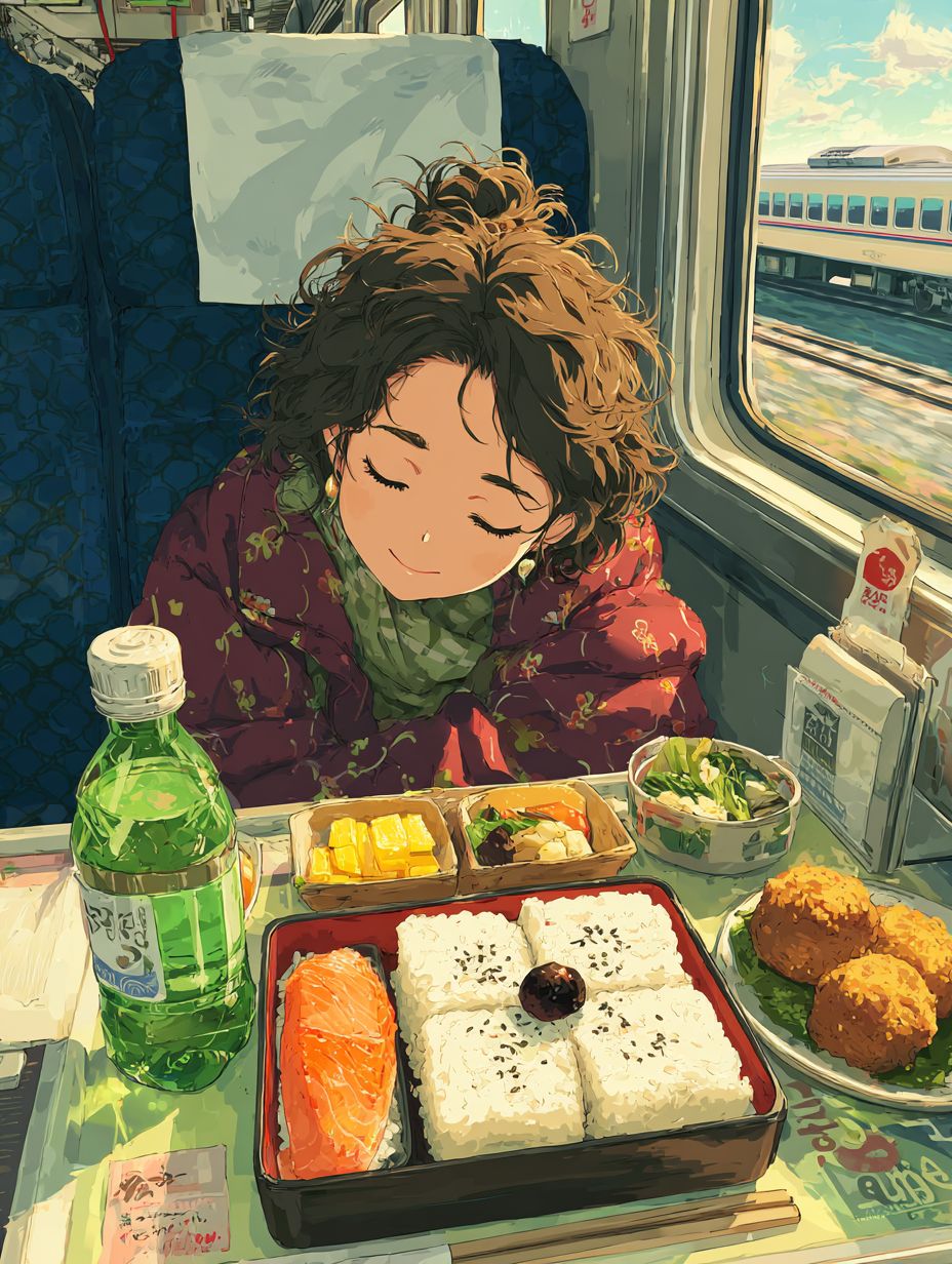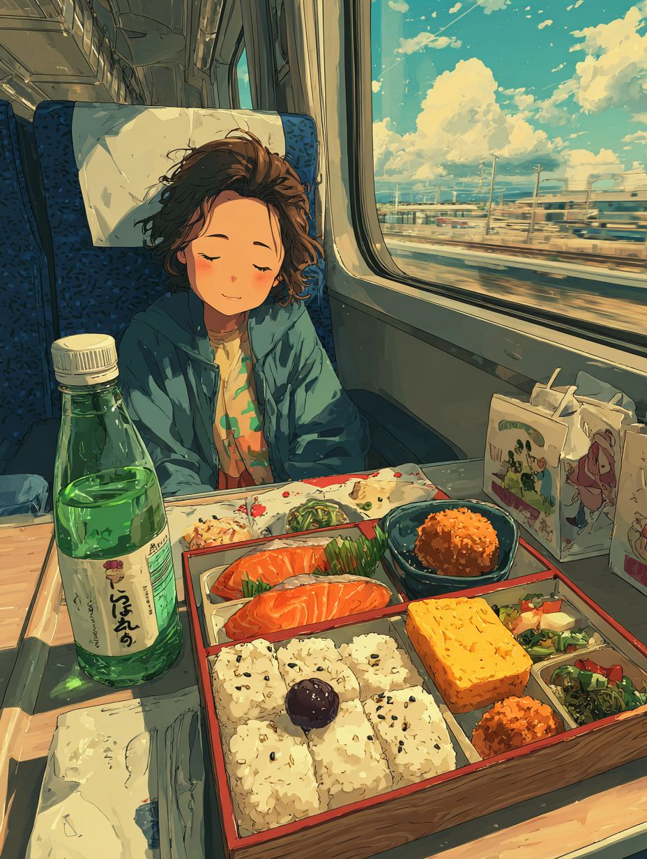 Estilo anime-manga, rosto kawaii de mulher japonesa, expressão sonolenta mas sorridente, desfrutando do desjejum em um trem Shinkansen, um bento makunouchi japonês tradicional em uma caixa de papel, arroz branco dividido em pequenos blocos, umeboshi no centro, gergelim preto polvilhado, salmão grelhado, tamagoyaki (omelete japonesa), daikon cozido, vegetais em conserva, um item frito simples como karaage ou croquete, textura realista, cores equilibradas, arranjo minimalista, mas bonito, uma garrafa plástica de chá verde, rótulo da garrafa realista, leve condensação, mãos com cinco dedos anatomicamente realistas, dedos altamente detalhados, dedos corretos, sem dedos deformados, luz solar da manhã através da janela do trem, vista exterior mostra borrão de movimento indicando viagem em alta velocidade, tons de cores quentes e pacíficos, profundidade de campo, interior do trem Shinkansen, mesa de bandeja e vista da janela.