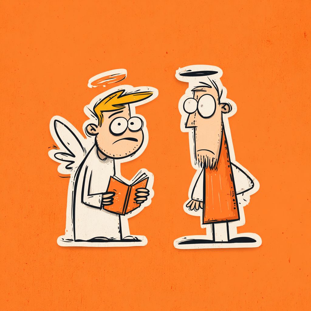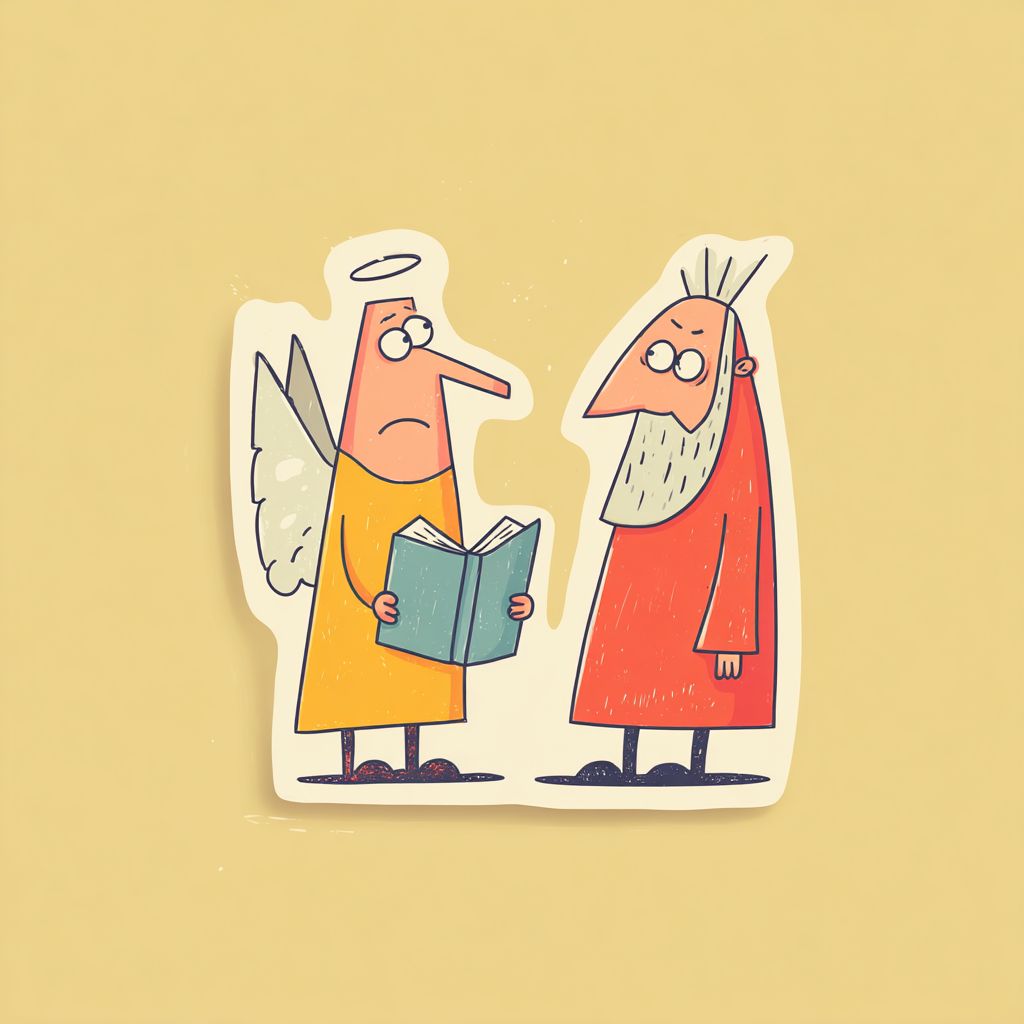 An angel with wings, holding a book, is talking to a worried man in a robe, exaggerated cartoon, angular figures, modern cartoon, clean vector lines, color, black outline, t-shirt graphic, isolated on a solid color background, cut sticker --no noise --raw --profile r19slmm