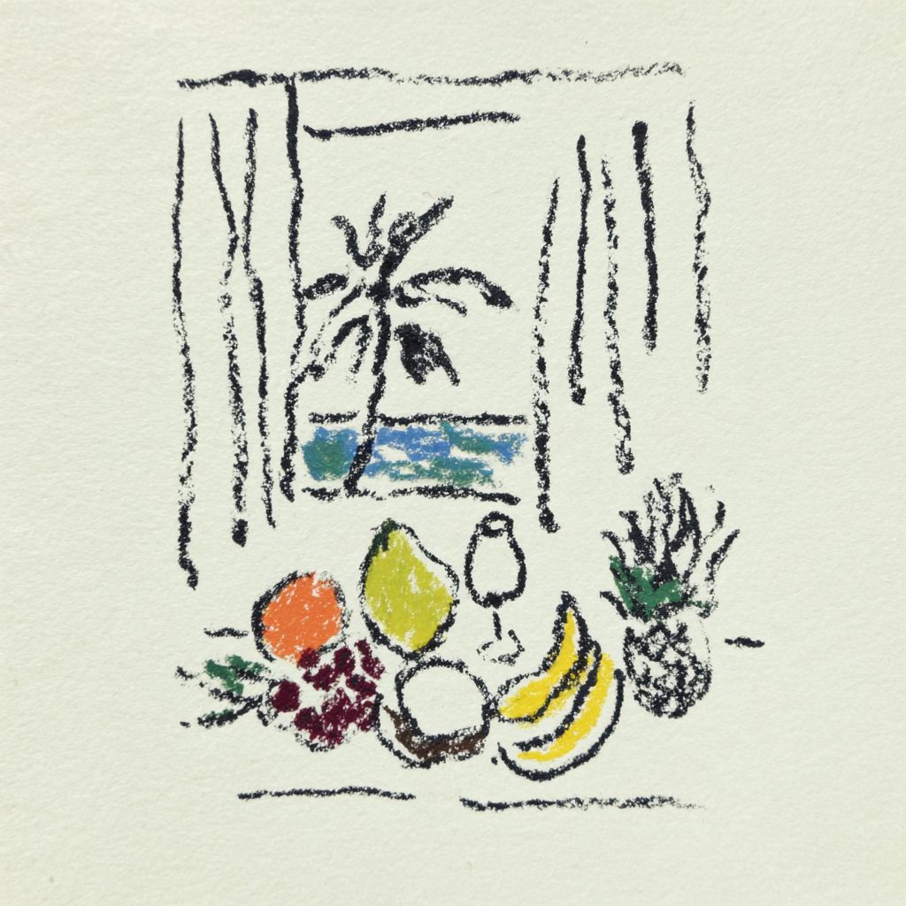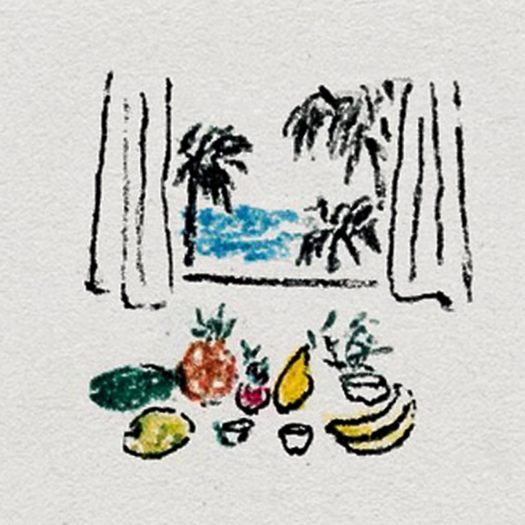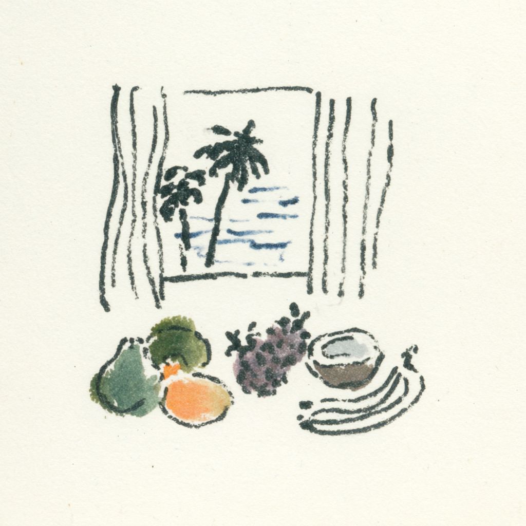 Design de camiseta com arte em linha preta, apresentando uma natureza morta de frutas tropicais e uma janela com vista para uma ilha
