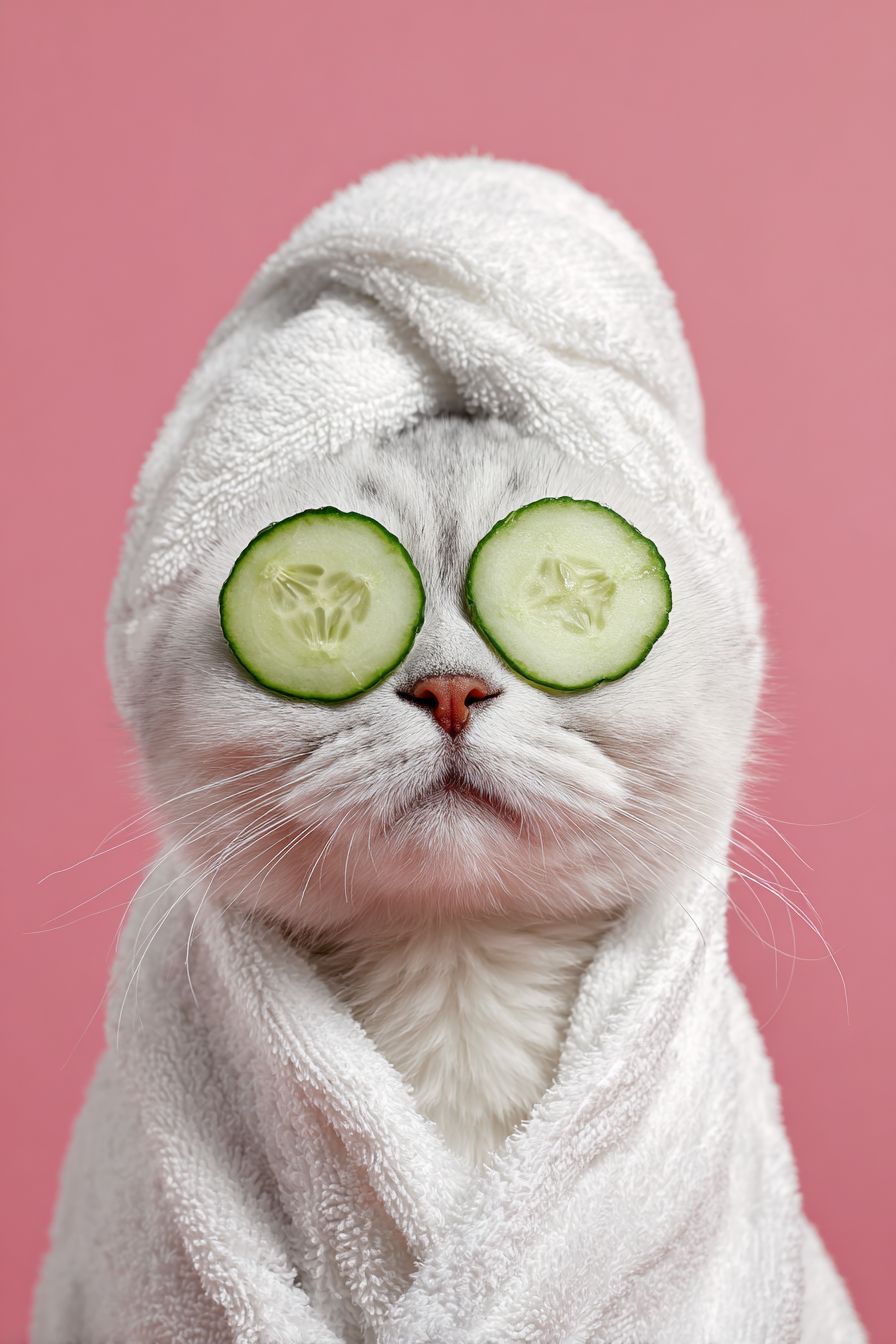 a cat with cucumber slices on its eyes, wearing white towel around the head and back in front of pink background, spa atmosphere, soft lighting, cute style, high detail --ar 2:3 --v 7.0