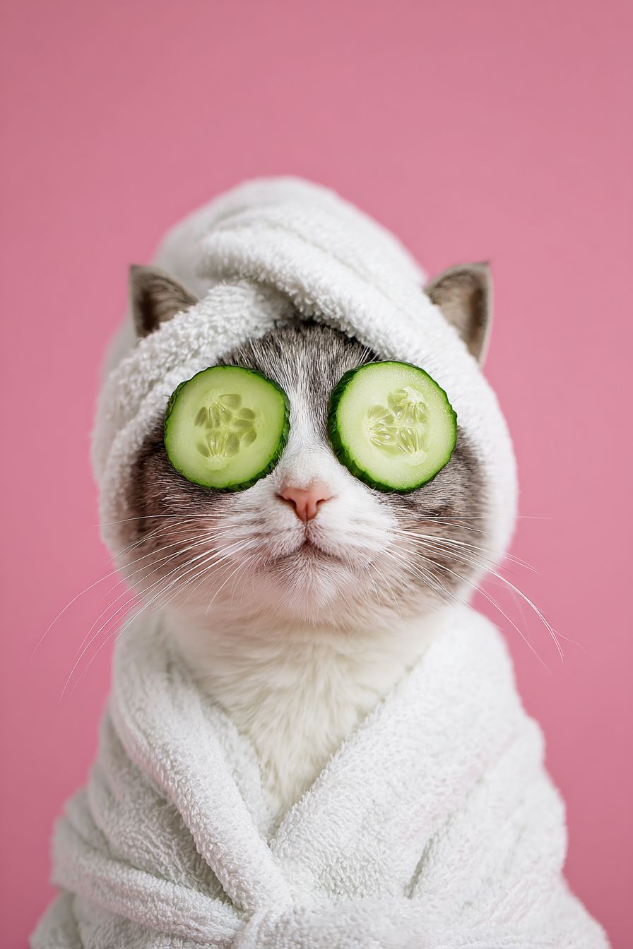 Um gato com fatias de pepino nos olhos e uma toalha branca na cabeça em frente a um fundo rosa cria uma atmosfera de spa