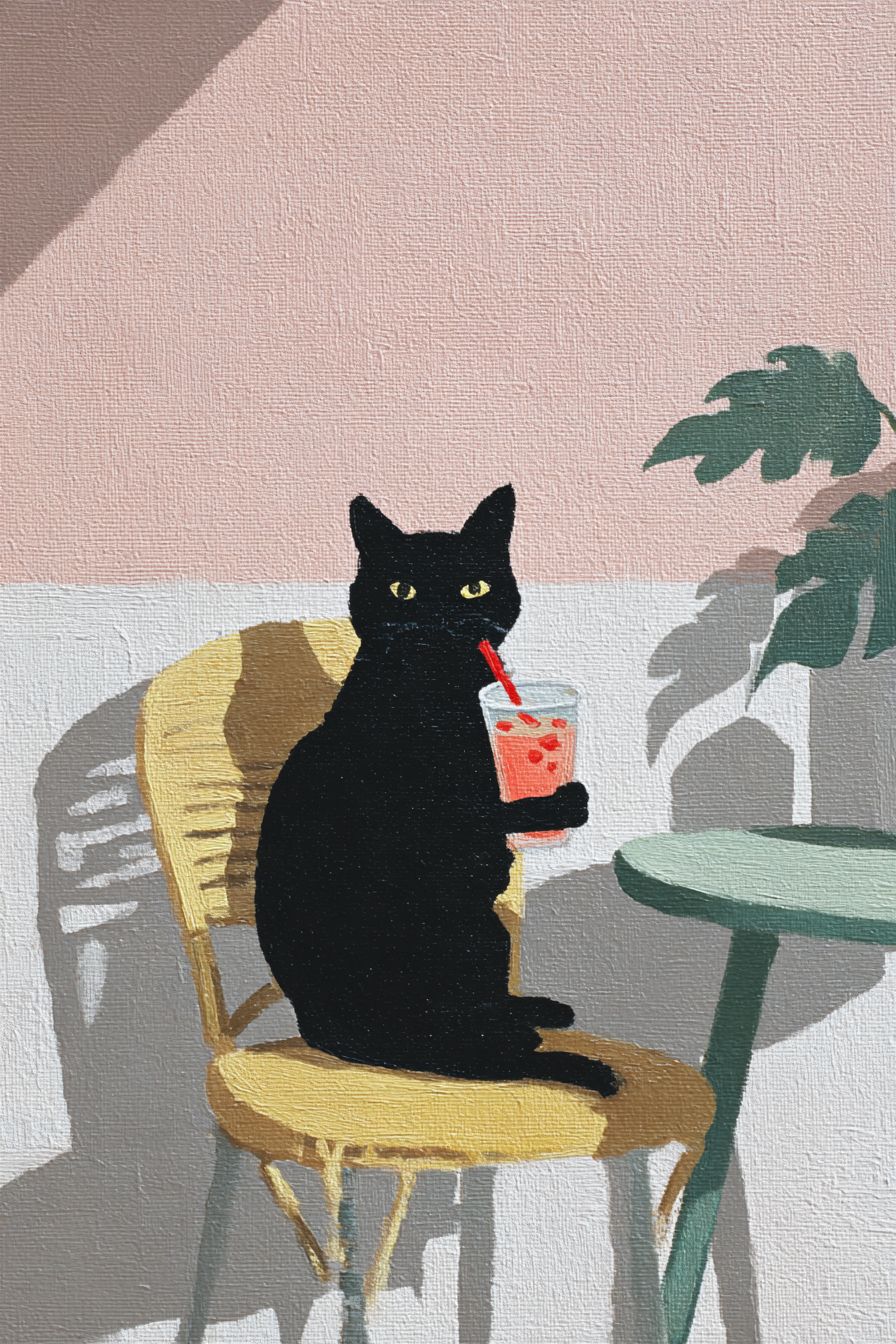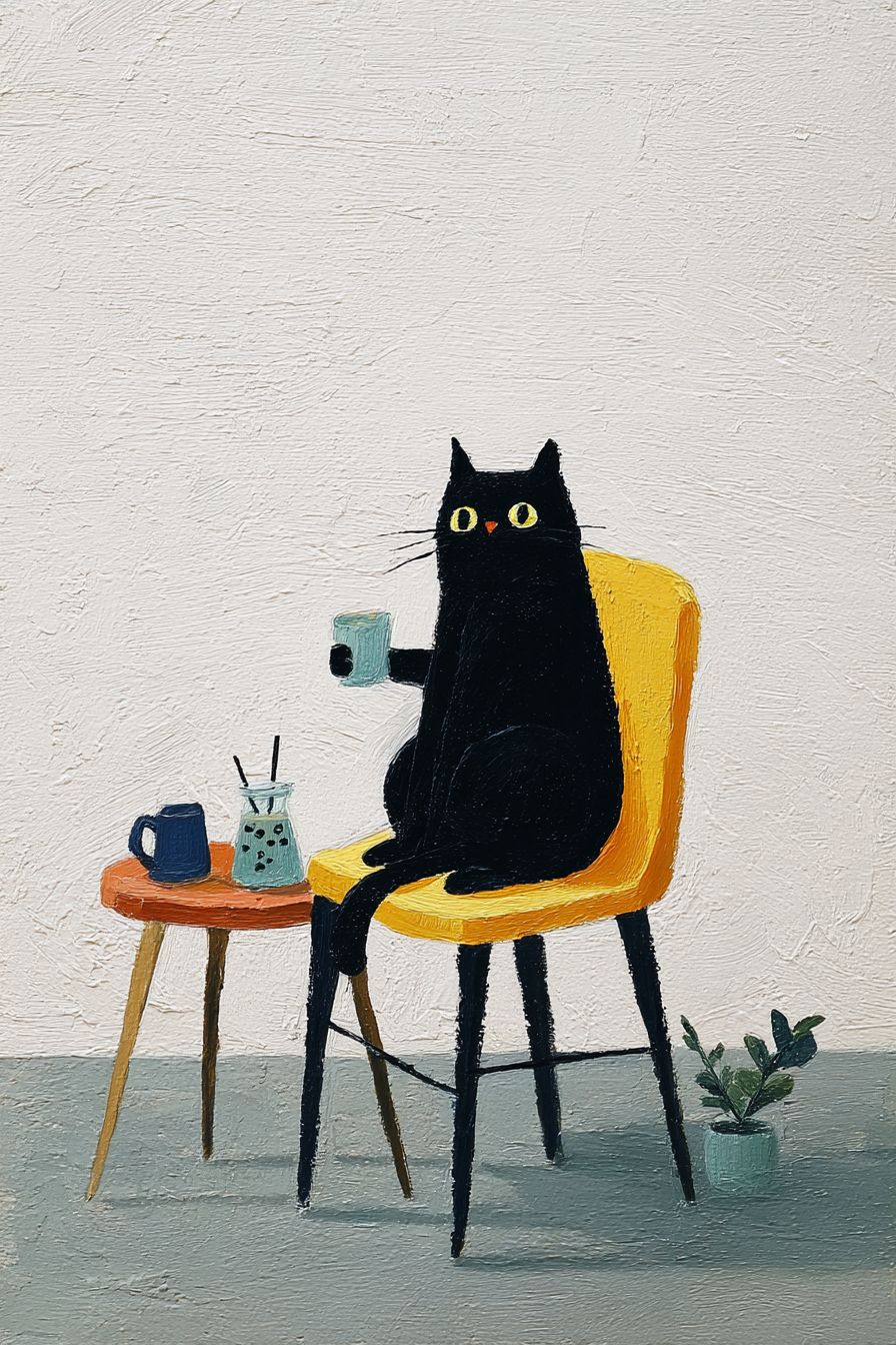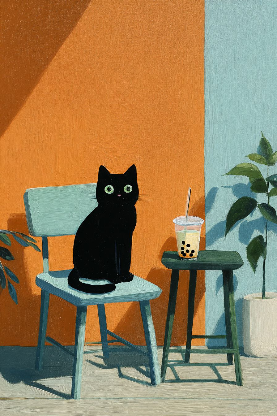 Um gato preto sentado em uma cadeira bebendo chá de bolhas