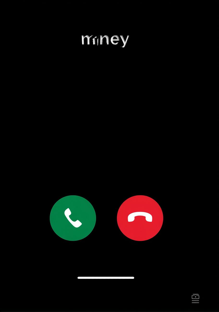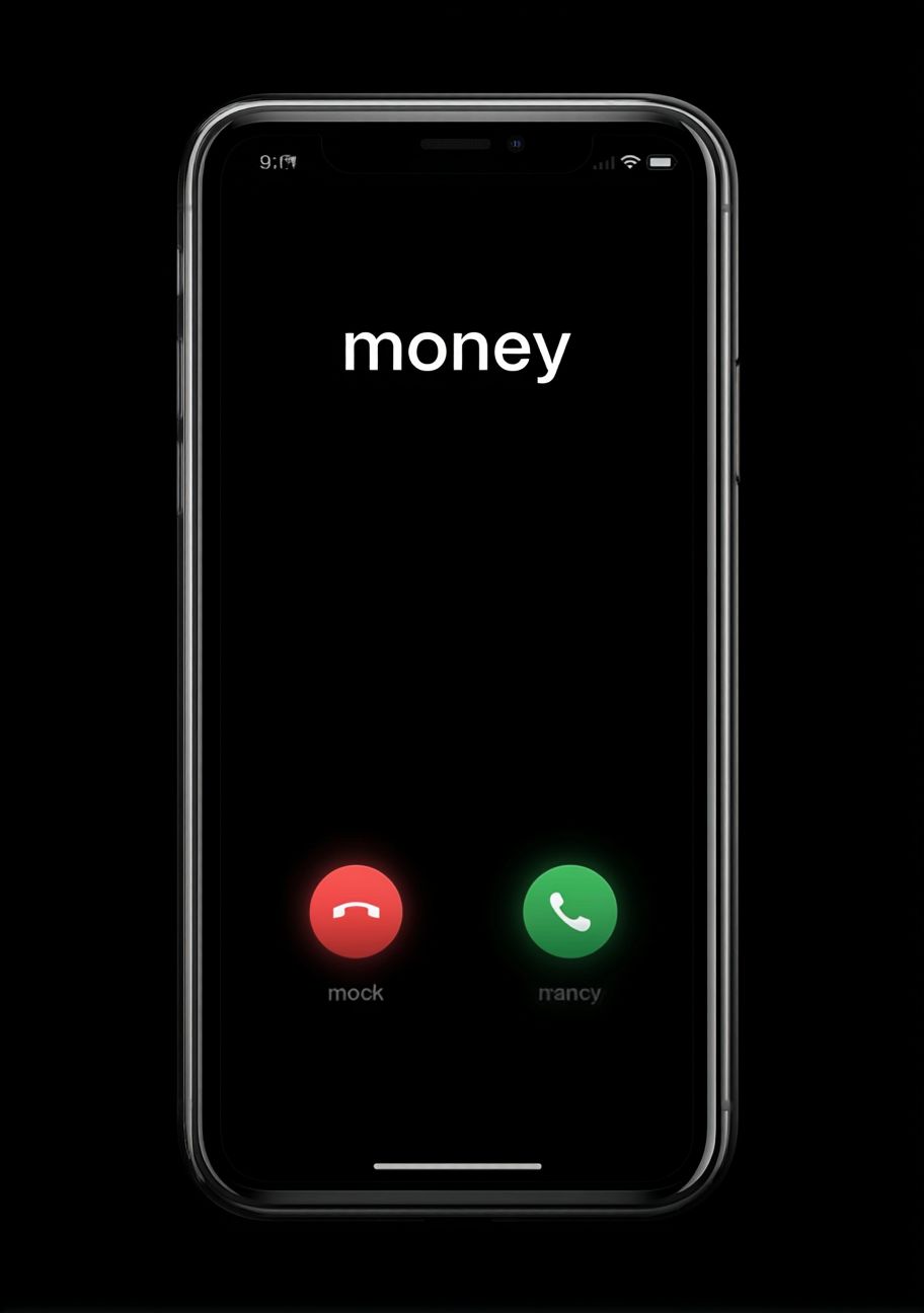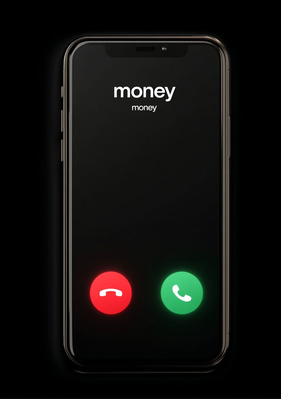 Uma foto da tela de um iPhone com dois botões, um vermelho e o outro verde, com a palavra 'money' escrita em letras brancas, tudo contra um fundo preto. O botão de chamada não tem nome, apenas texto. Acima, há outro nome 'money', tudo em um estilo minimalista.