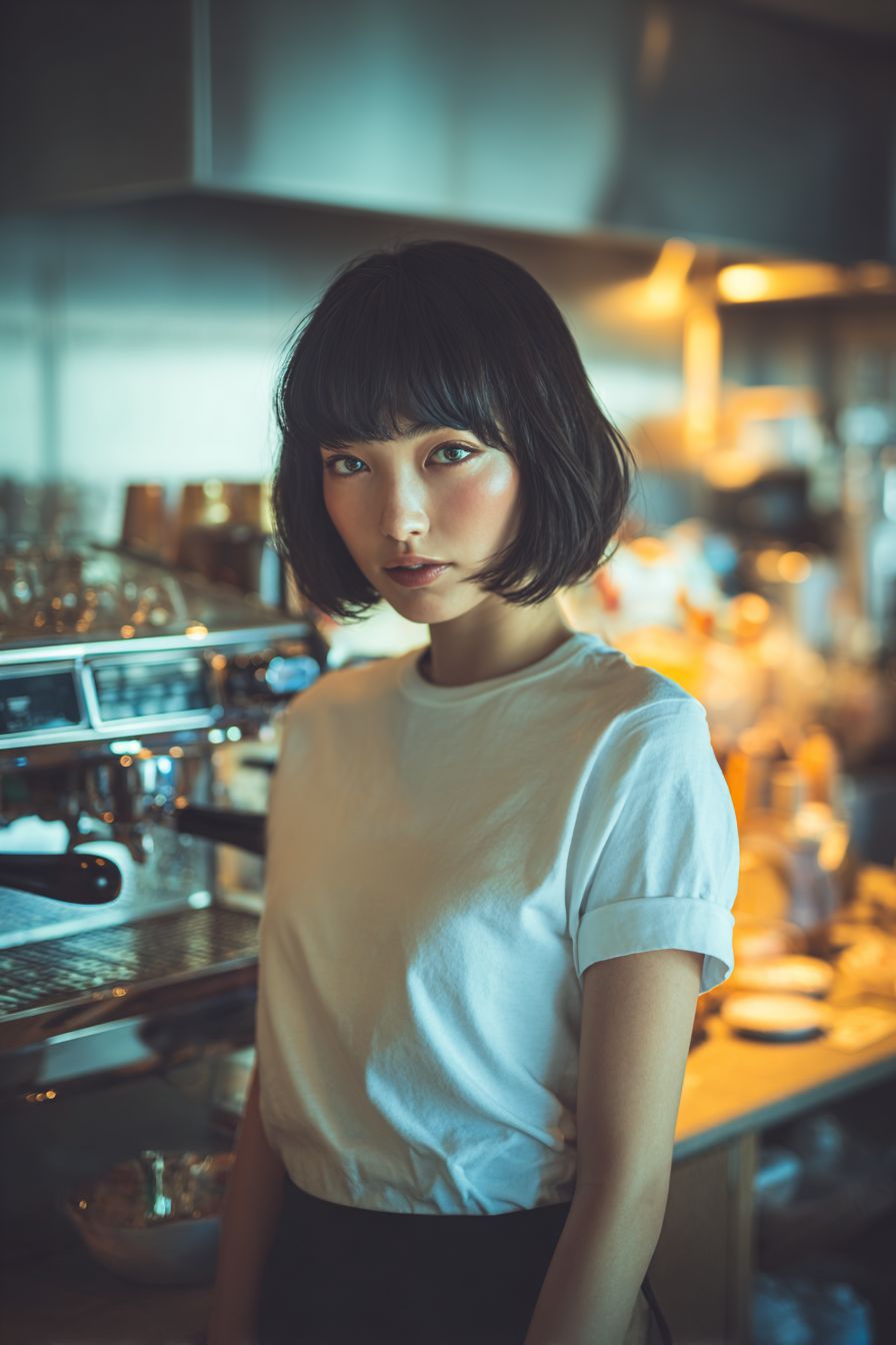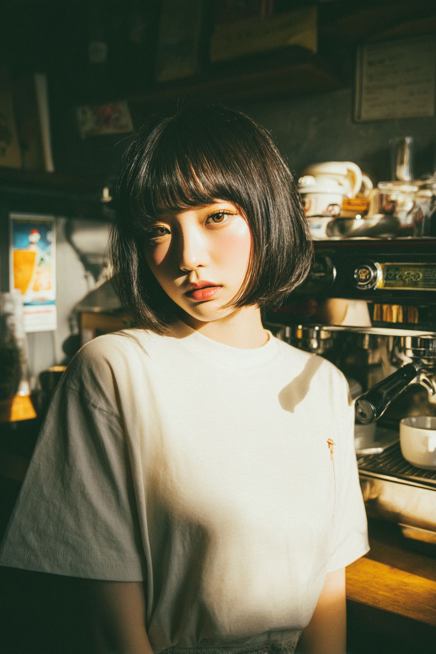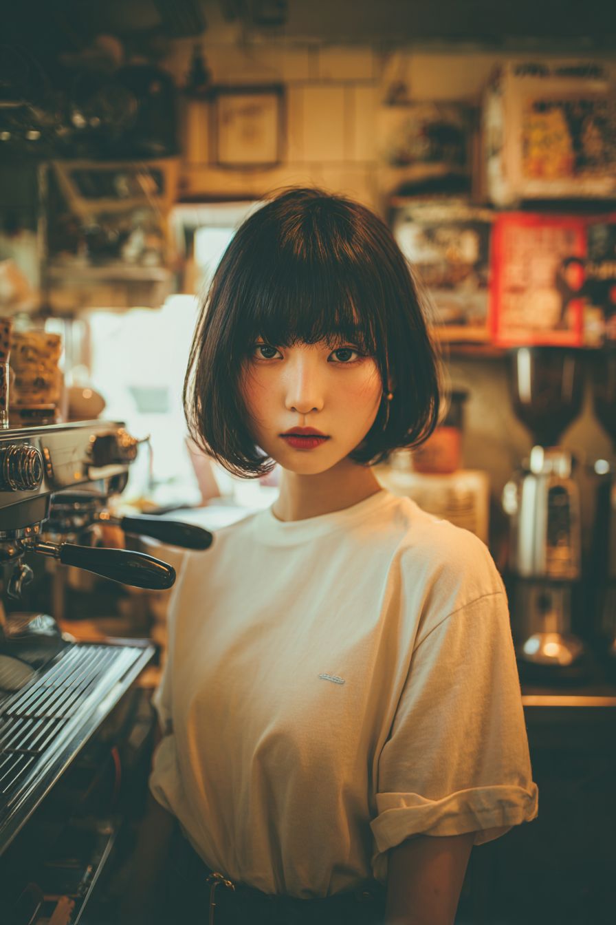 A stylish portrait of an 18-year-old Japanese girl with a neat bob haircut, captured in an eyeliner shot. She is wearing a simple T-shirt with a fashionable touch, standing behind the counter of a café. In the background, an espresso machine and other elements of a café kitchen can be seen, adding to the authentic atmosphere. The lighting is soft and natural, creating a warm and inviting mood. Highly realistic, cinematic detail, captured in 8K ultra-high resolution. --ar 2:3