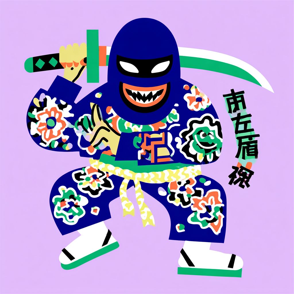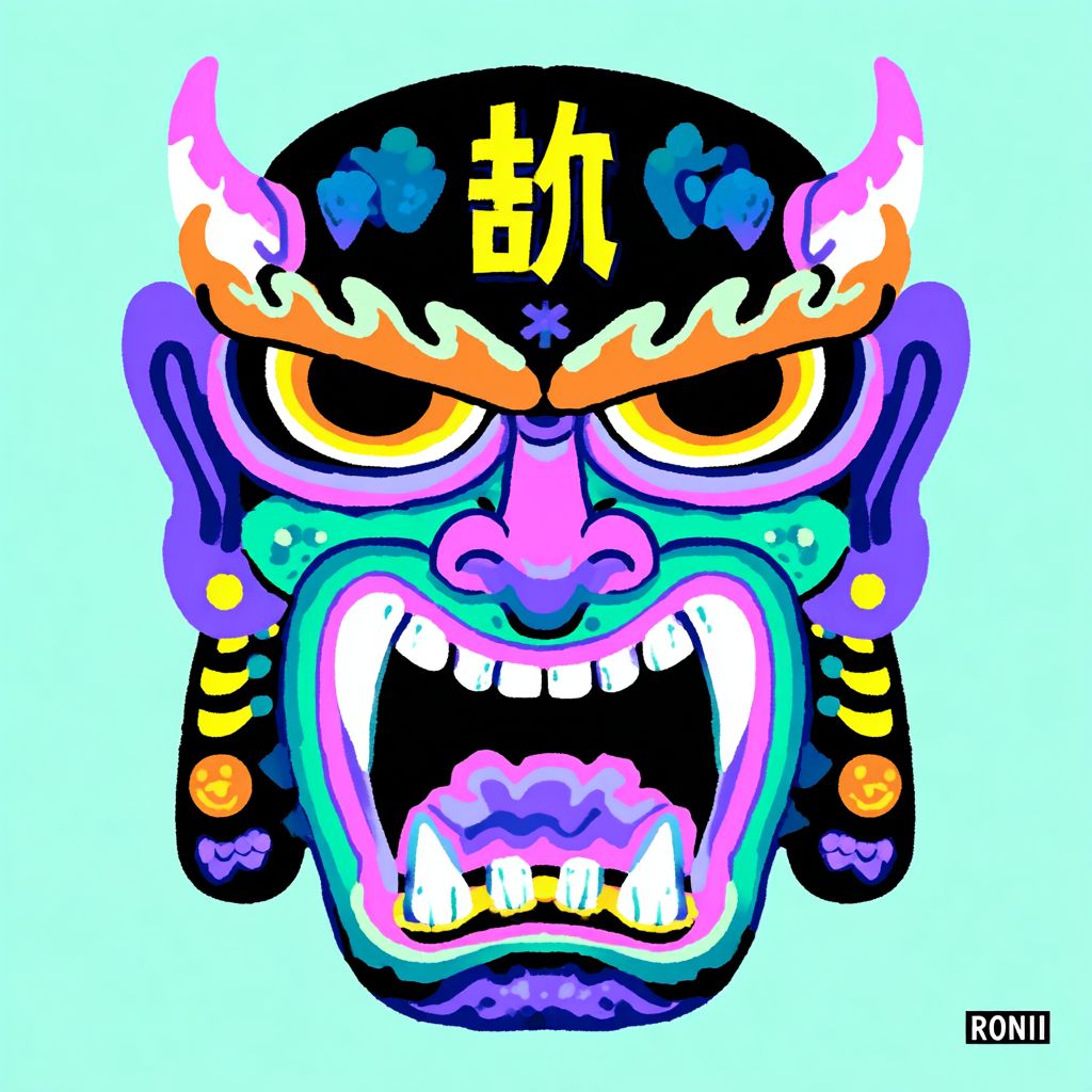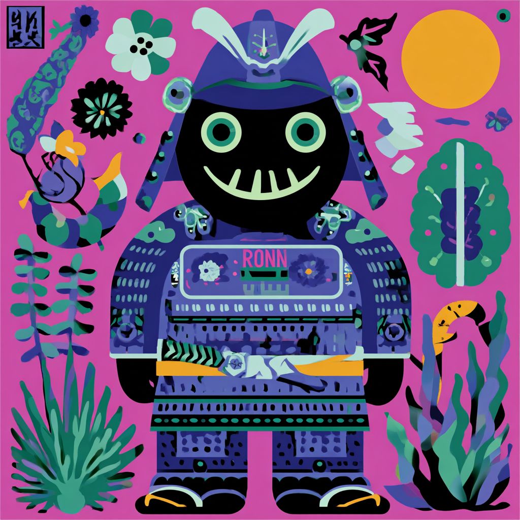 Um ninja ronin com rosto sorridente ácido em uma ogiva nuclear com a inscrição 'RONIN'