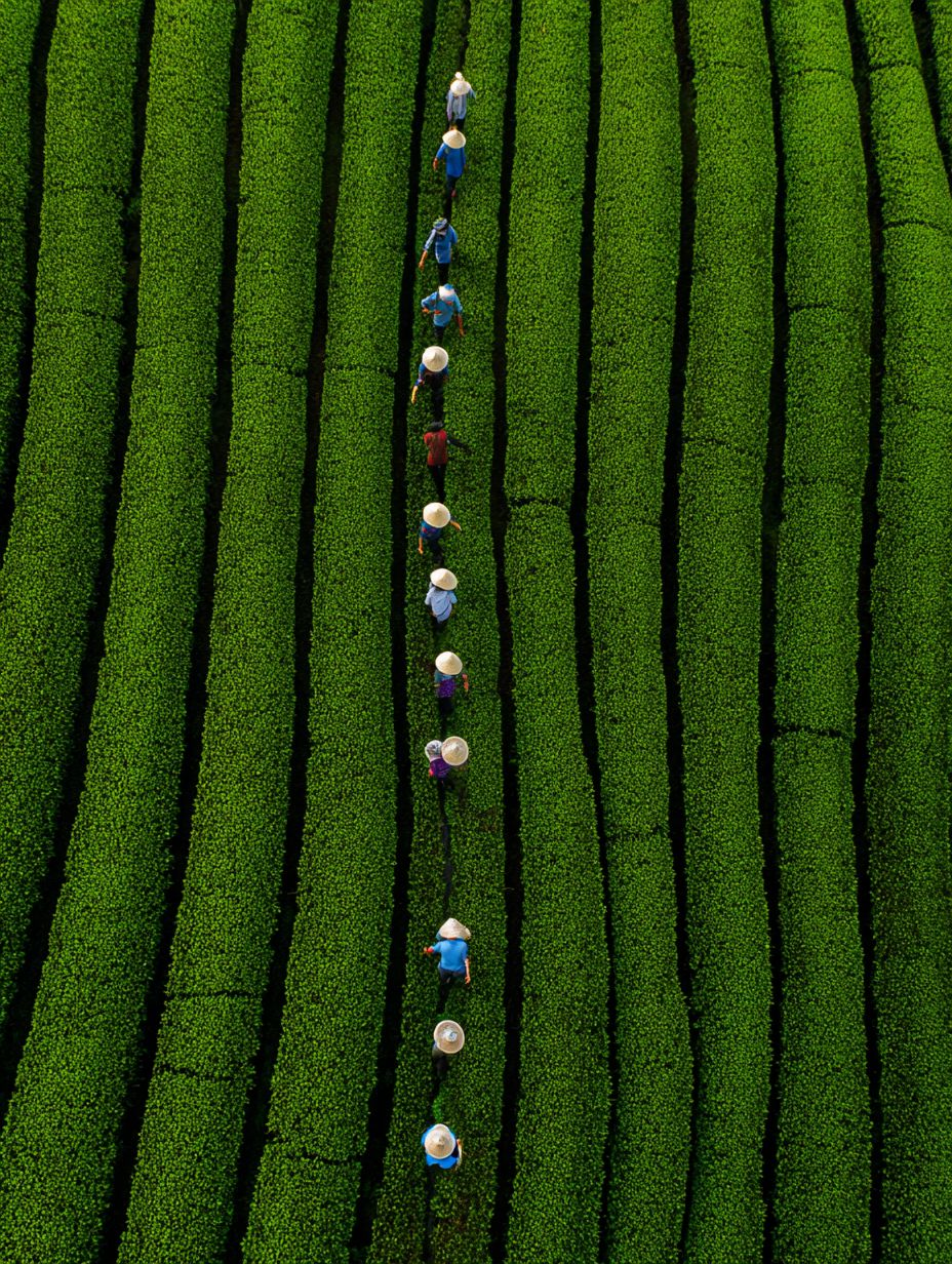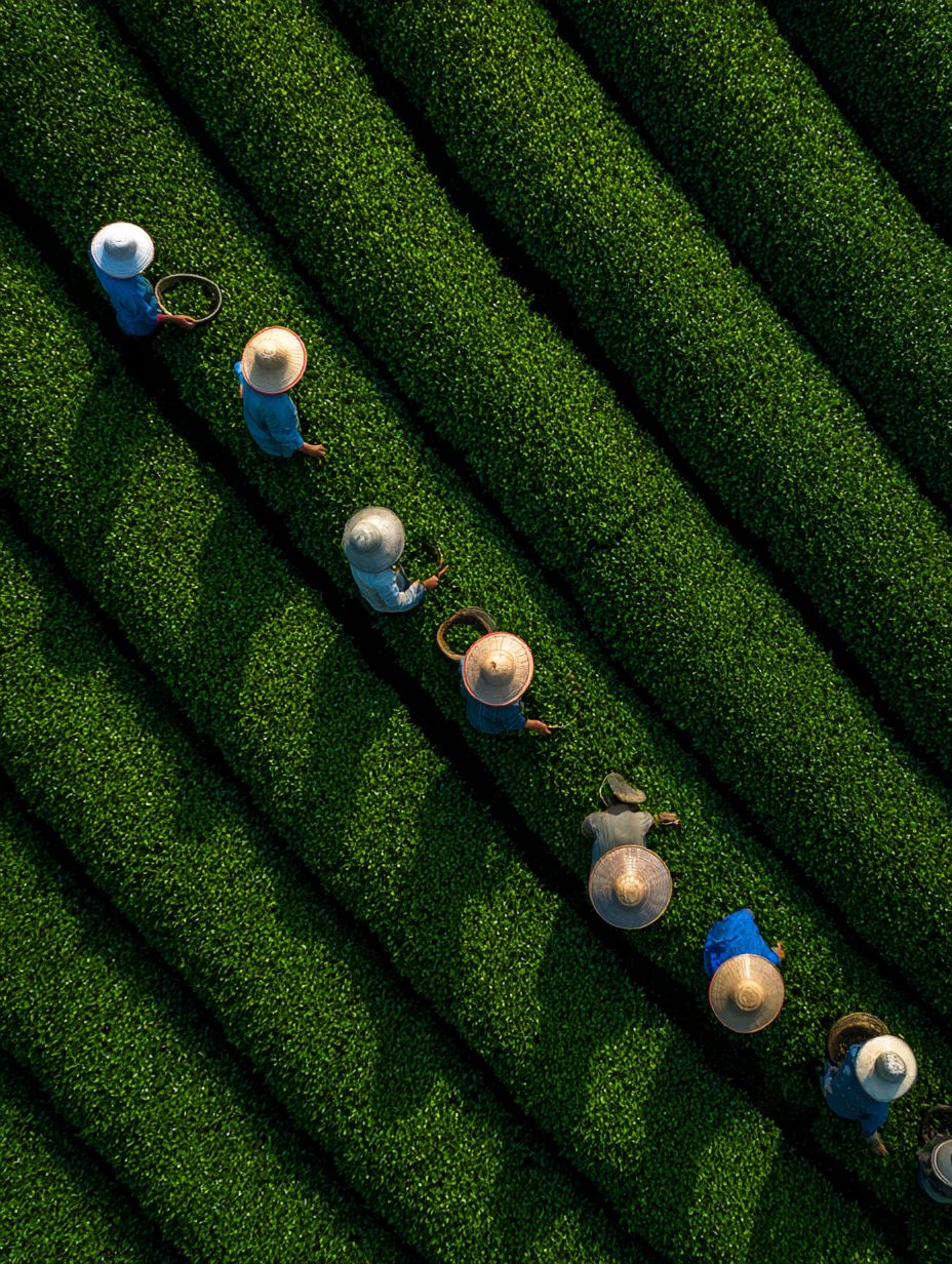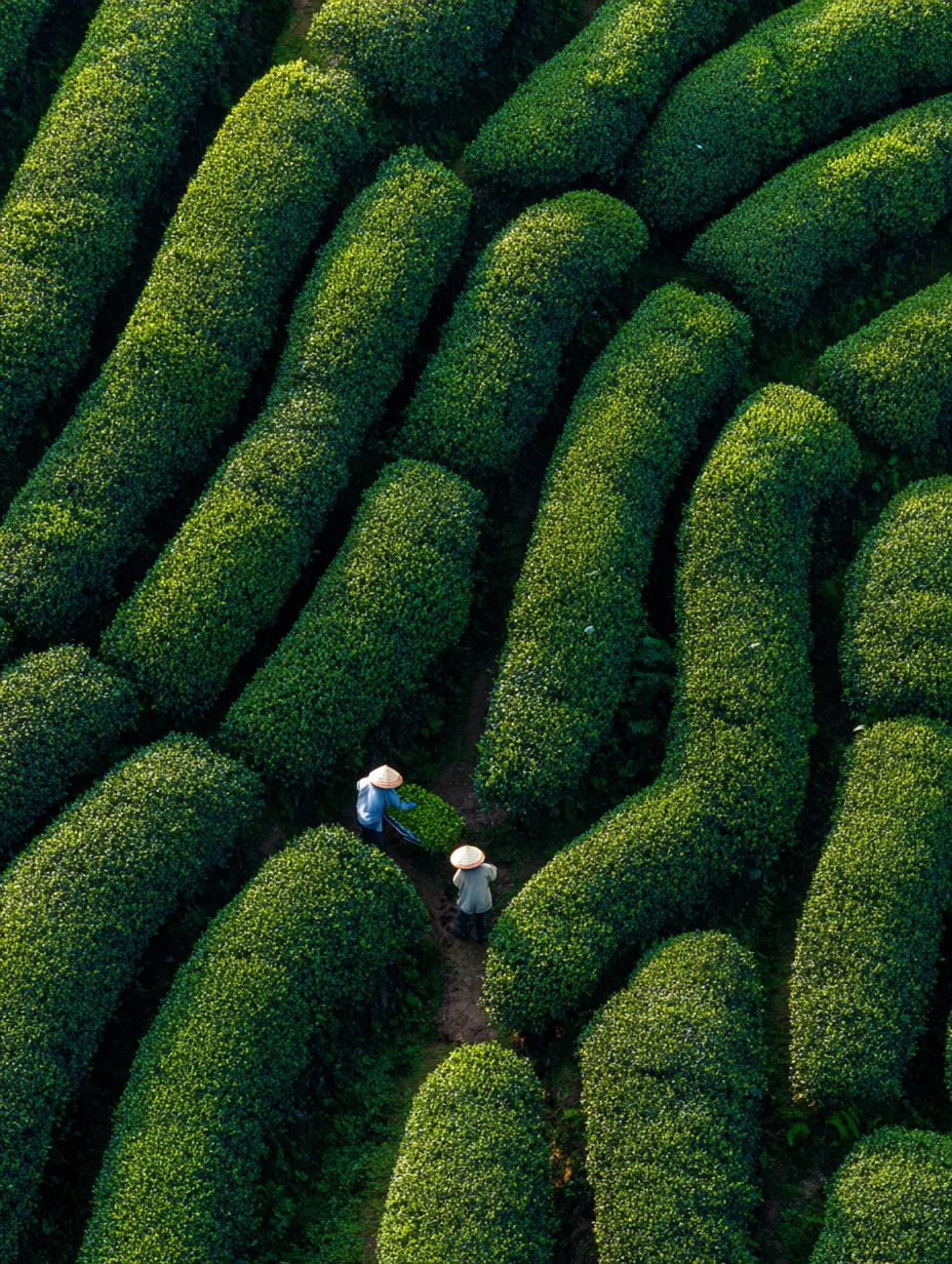 Aerial view of tea farmers picking green tea in the endless, dense, and symmetrically patterned tea fields. The scene is captured from above with a drone camera, showcasing the vastness and unity between people and nature. It highlights traditional Asian elements such as the farmers' hats, highlighting cultural heritage. High-resolution photography style, wide-angle lens to capture panoramic views, natural lighting to highlight details of action and colors. --ar 3:4 --raw