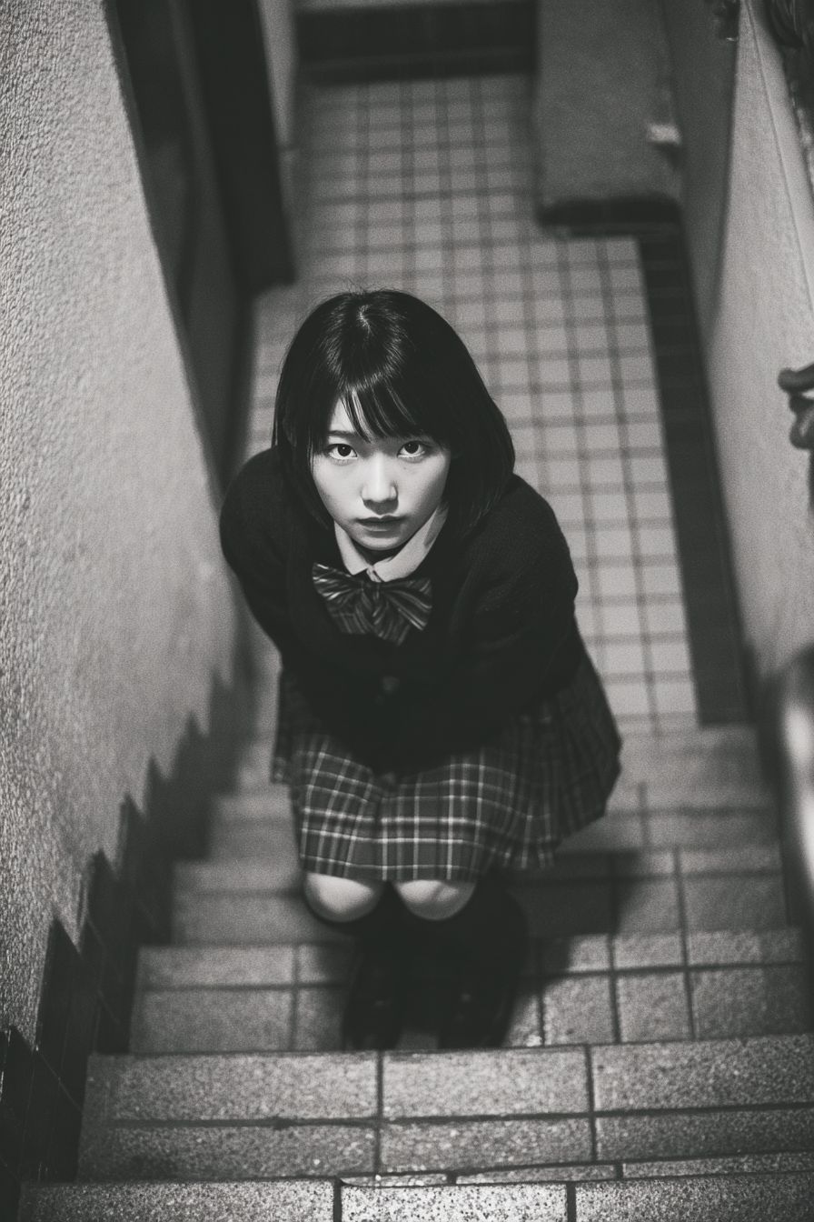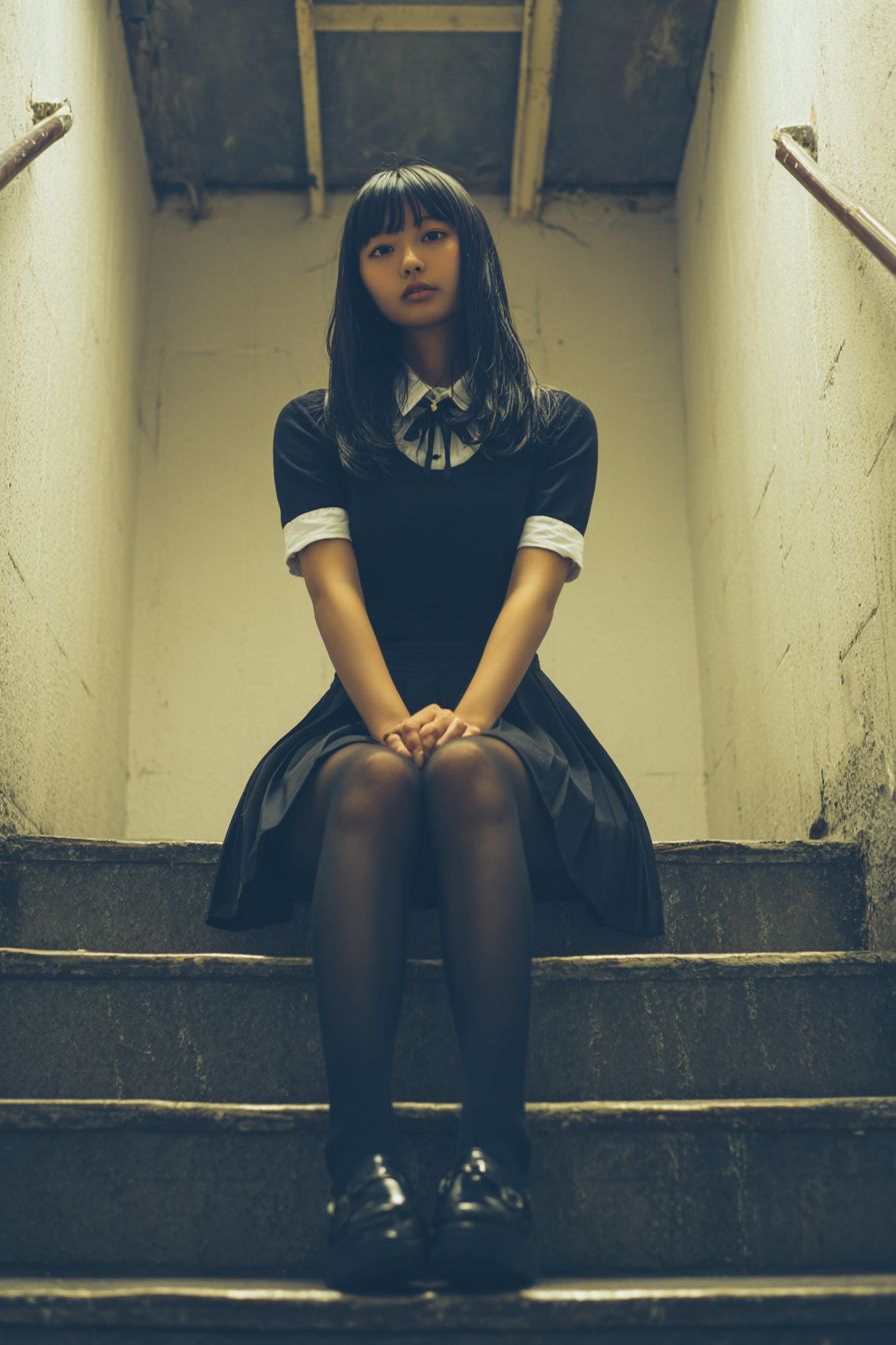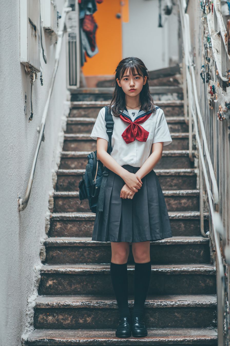 A jovem japonesa está vestindo um uniforme escolar JK nas escadas