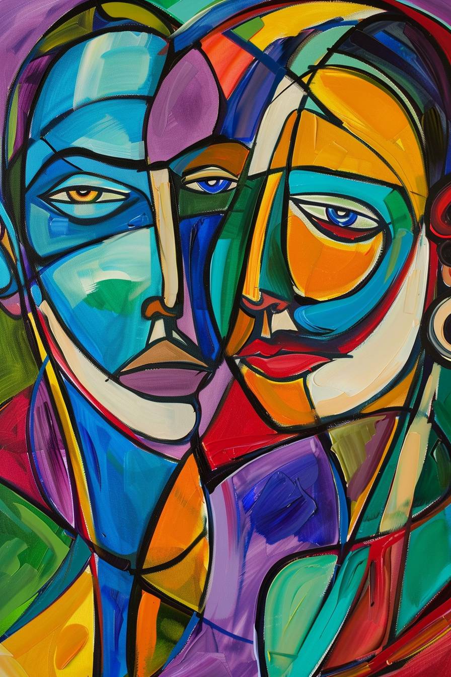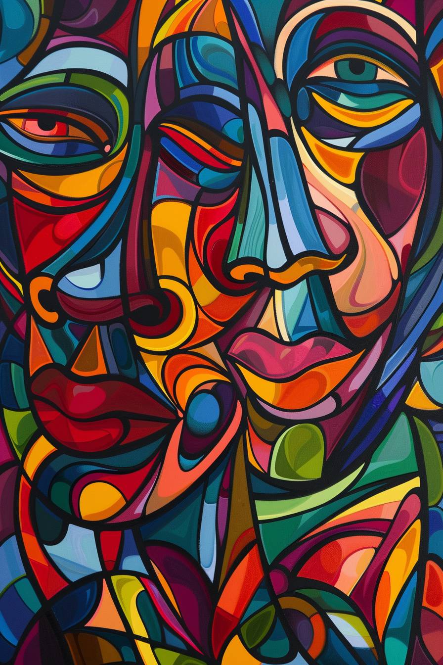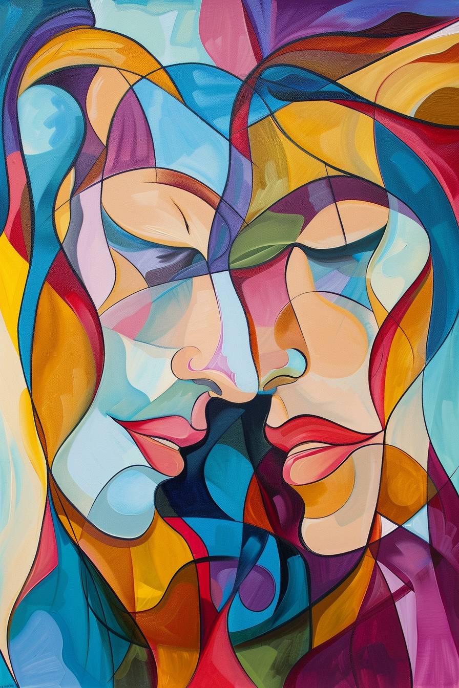 Uma pintura abstrata que representa um momento entre uma figura masculina e uma feminina, com cores vibrantes e linhas suaves que destacam expressões faciais detalhadas, e um fundo abstrato que complementa suas formas.