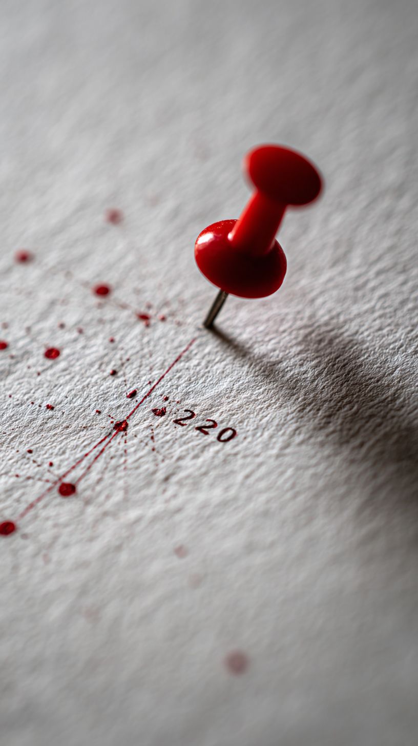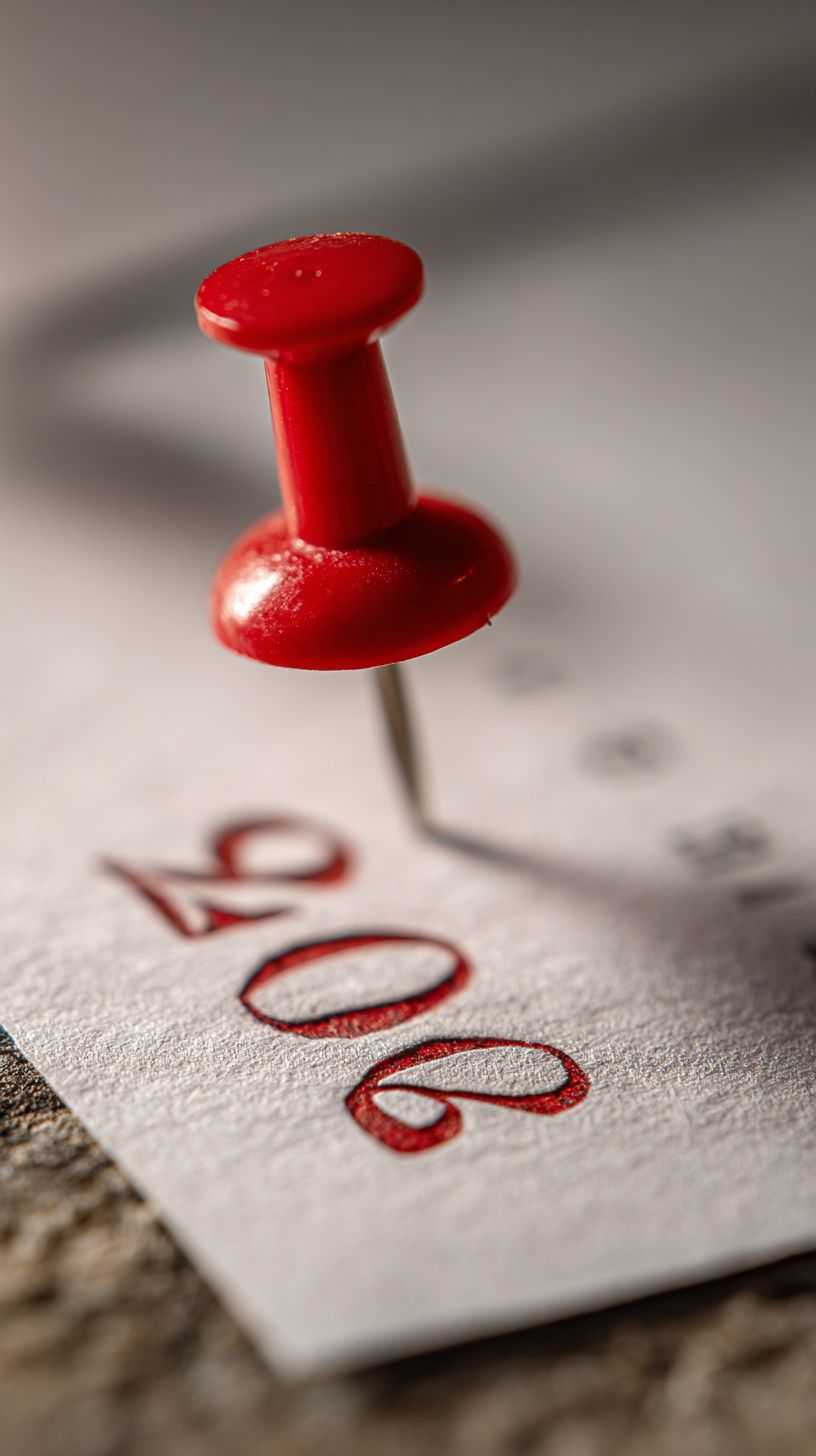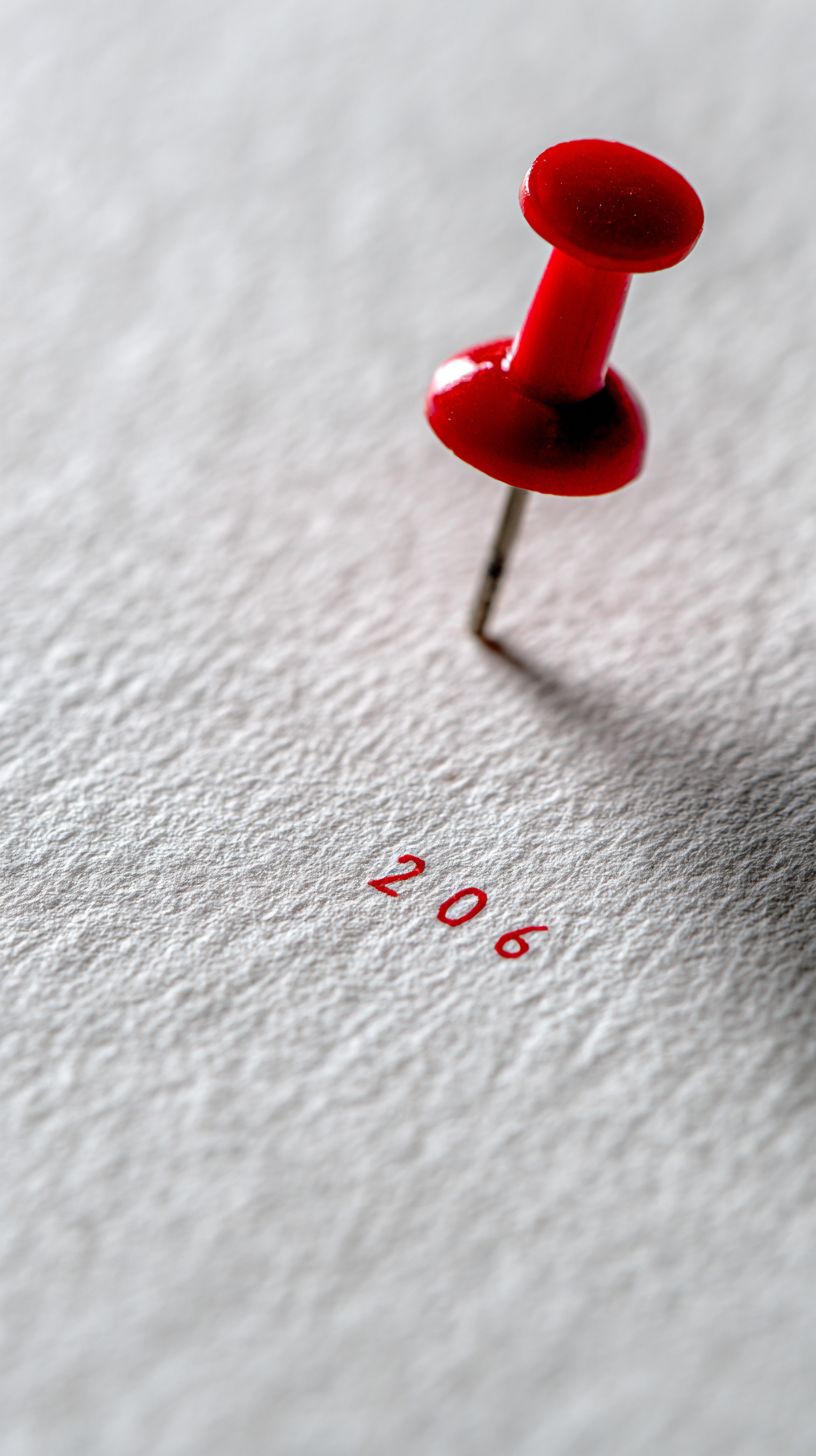 Um alfinete vermelho marca o ano de 2026 em papel branco