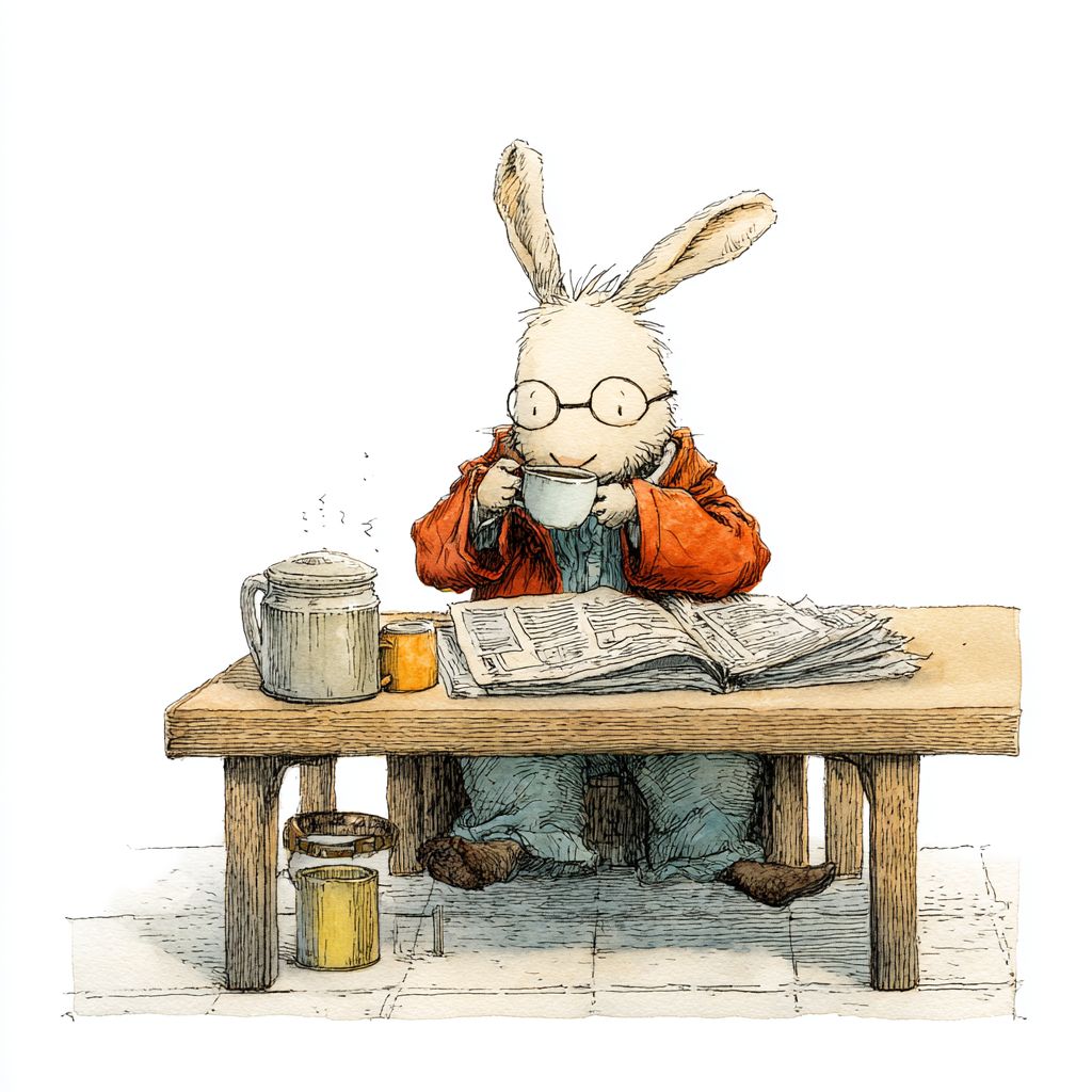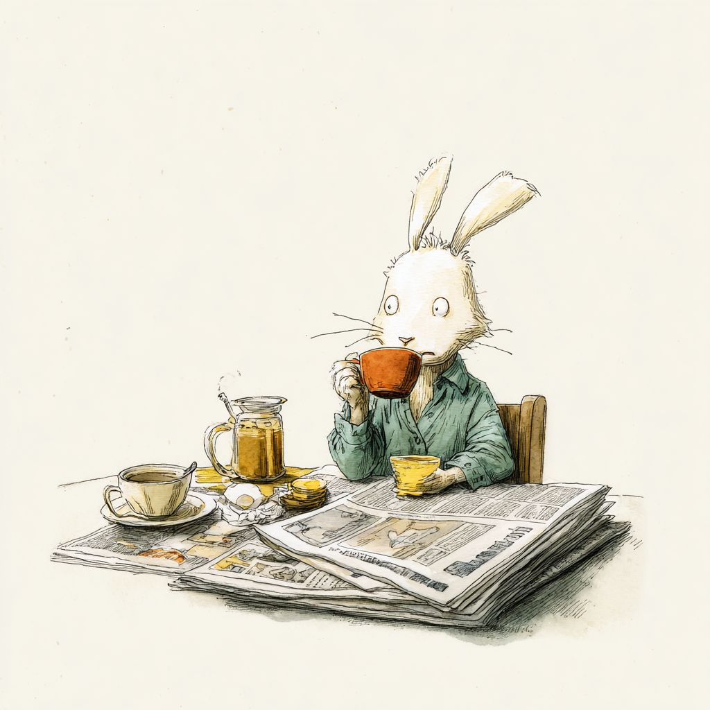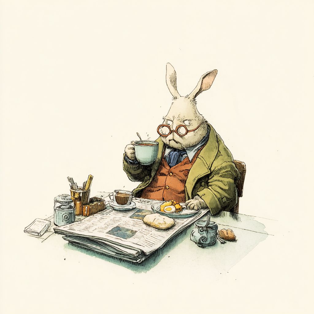 Illustration in the style of Raymond Briggs and Mattias Adolfsson, featuring a simple white background. Created using a mixed media of colored pencils and watercolors, the colors are soft, with delicate brushstrokes and exaggerated expressions rendered in ink wash. Mr. Rabbit is drinking coffee, having breakfast, and reading the newspaper. --v 7.0