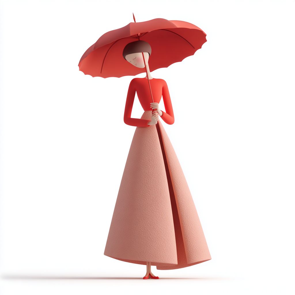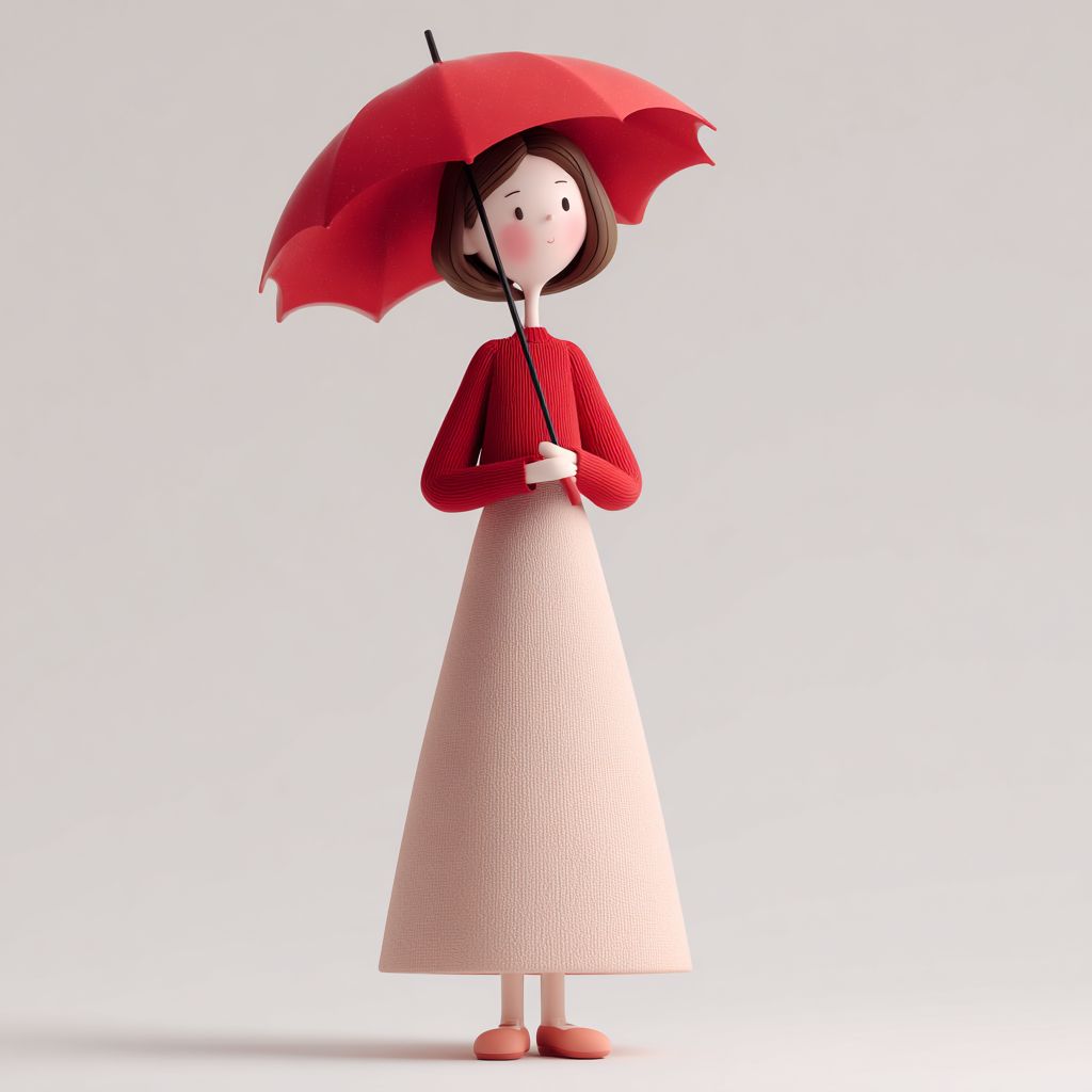 Uma ilustração fofa em 3D de uma mulher segurando um guarda-chuva vermelho, vestindo uma blusa vermelha e uma saia longa rosa