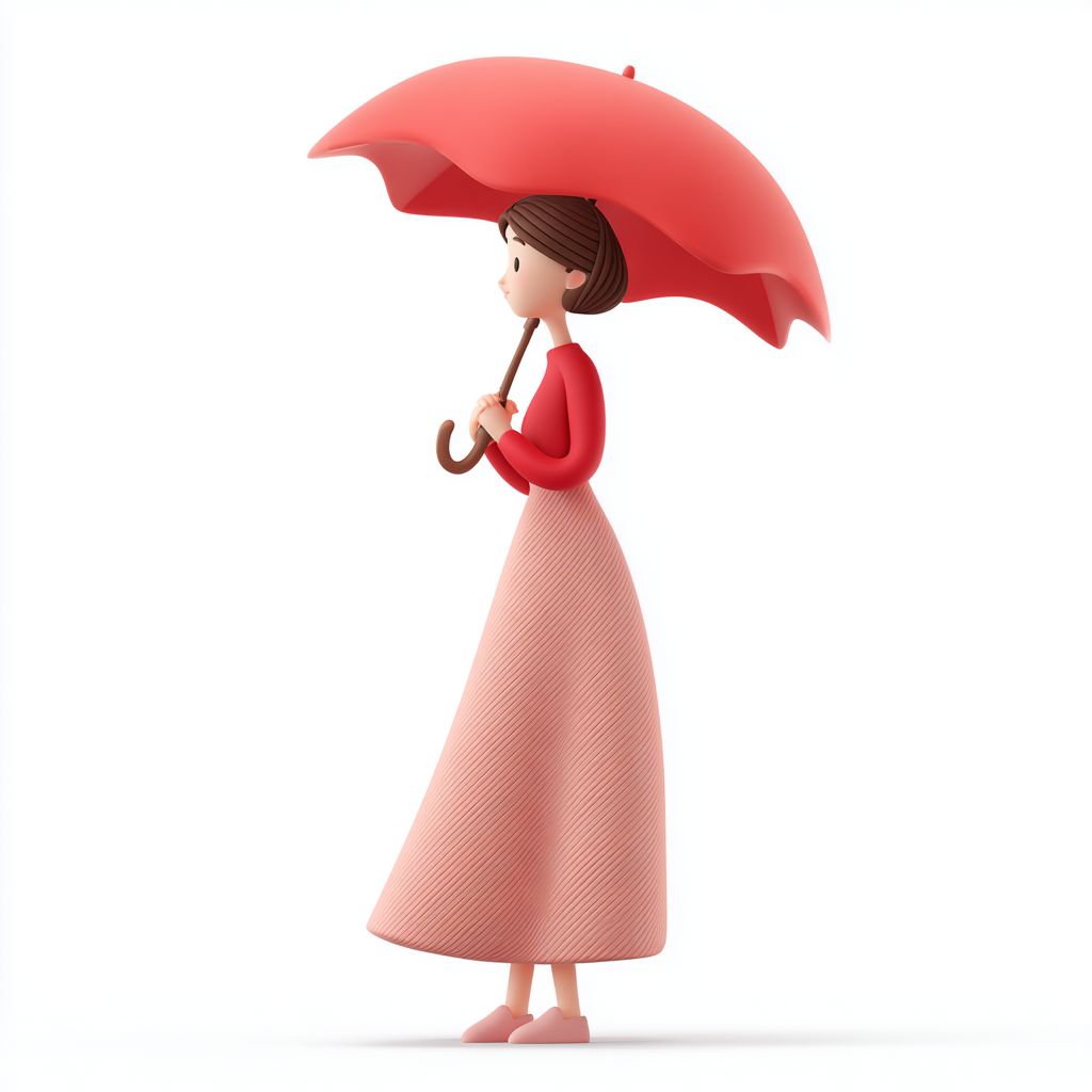 a cute 3D motion graphic style illustration of a woman holding a red umbrella, wearing a red top and pink long skirt, minimal and smooth surface, soft lighting, Pixar style, colorful clay render, studio lighting, stylized character, simplified shapes, no realistic texture, white background --v 7.0
