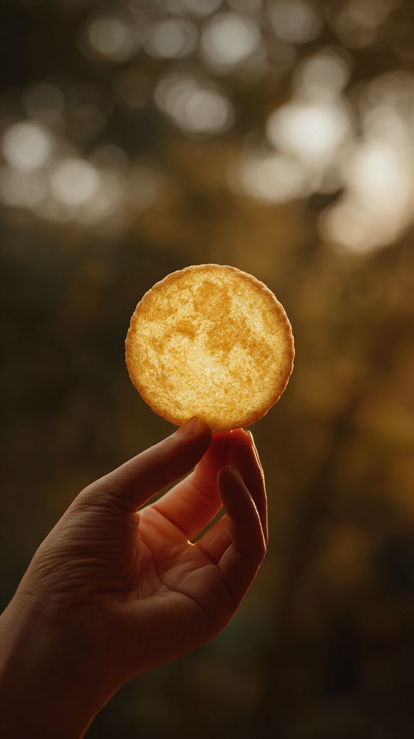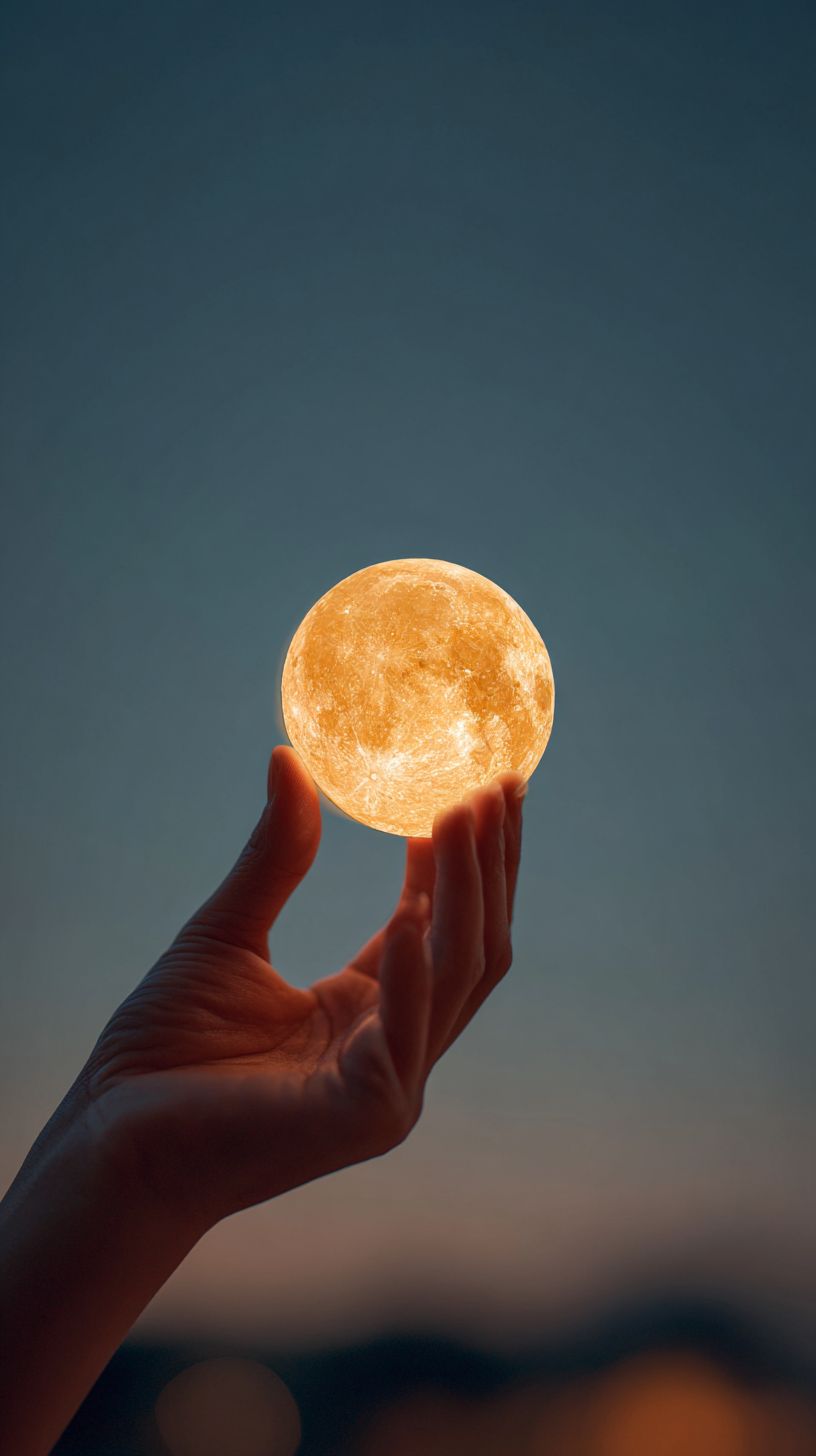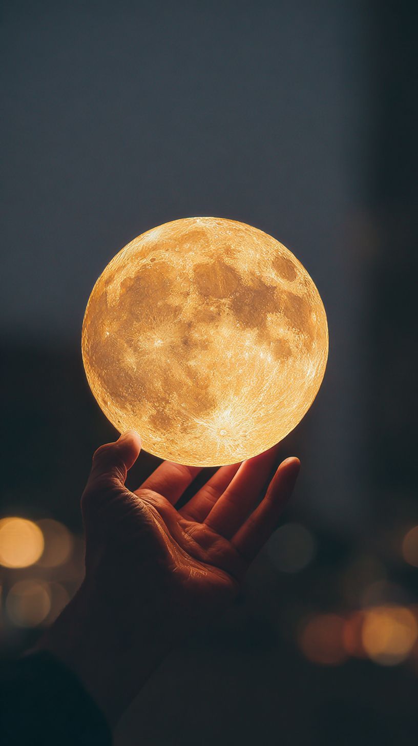 a golden full moon in the night sky, a person holding a golden mooncake and admiring the moon, warm light, detailed texture, soft lighting, cinematic composition, 4k, realistic photography --ar 9:16 --v 7.0