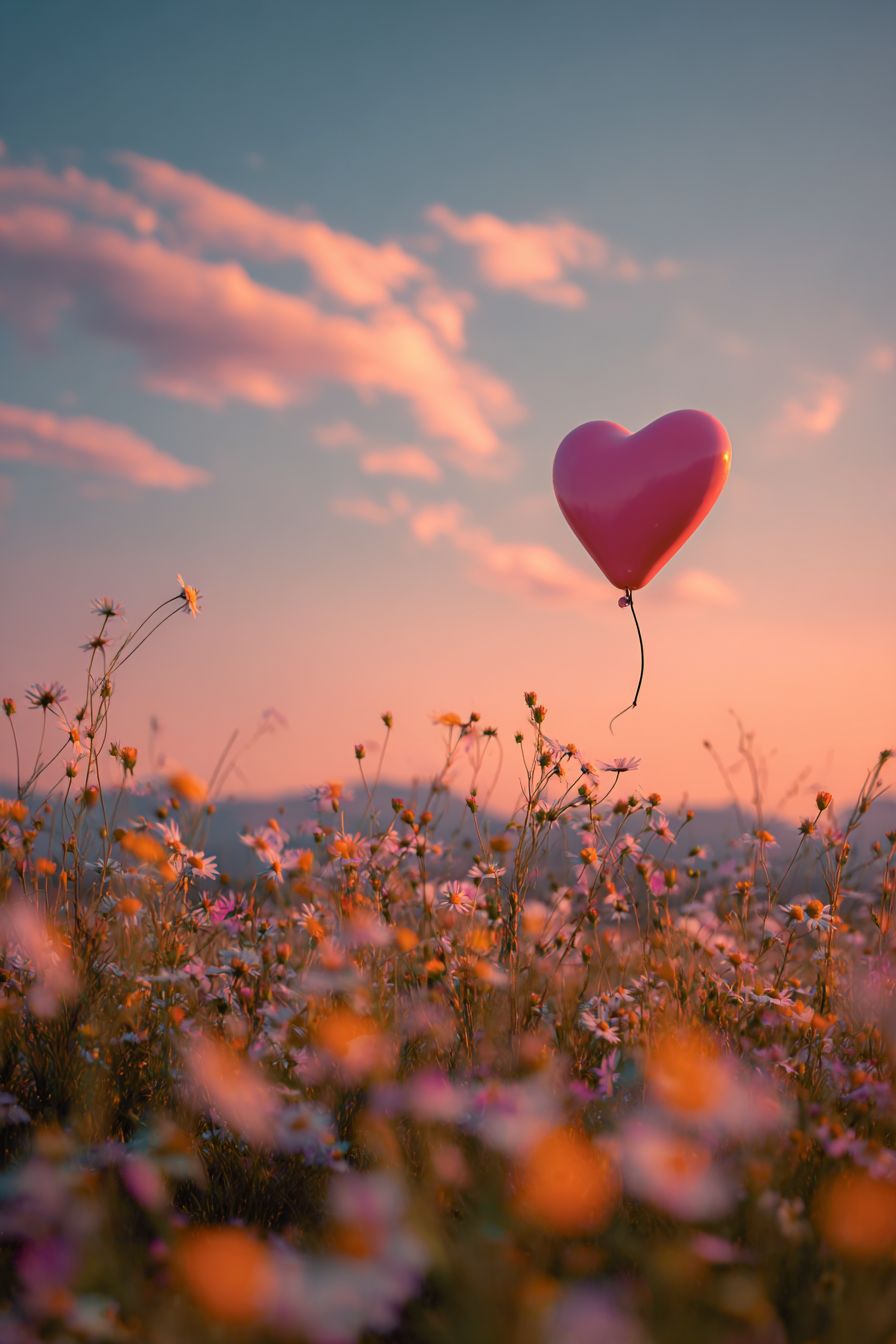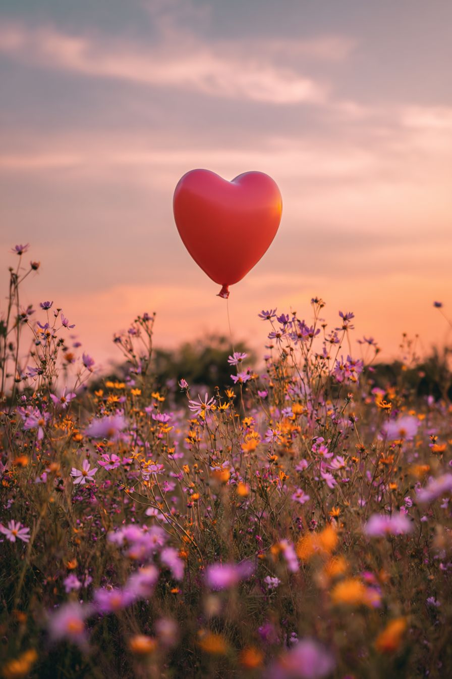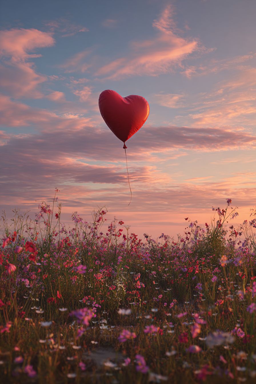 Um balão em forma de coração flutua sobre um campo de flores silvestres ao pôr do sol