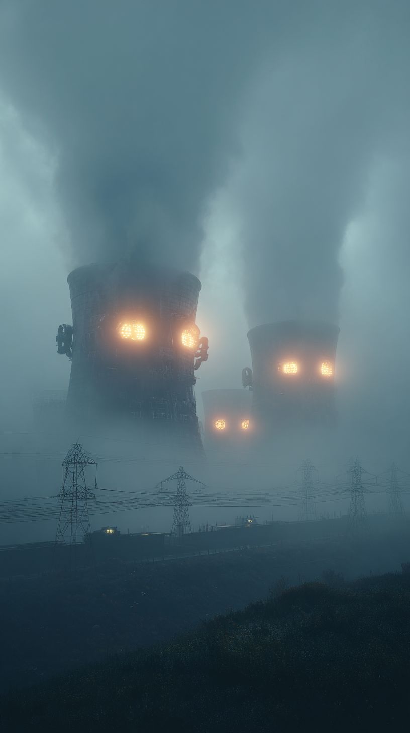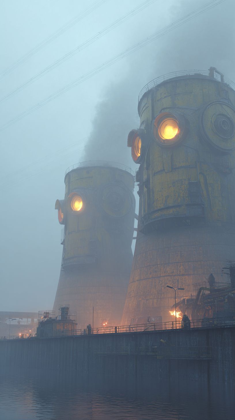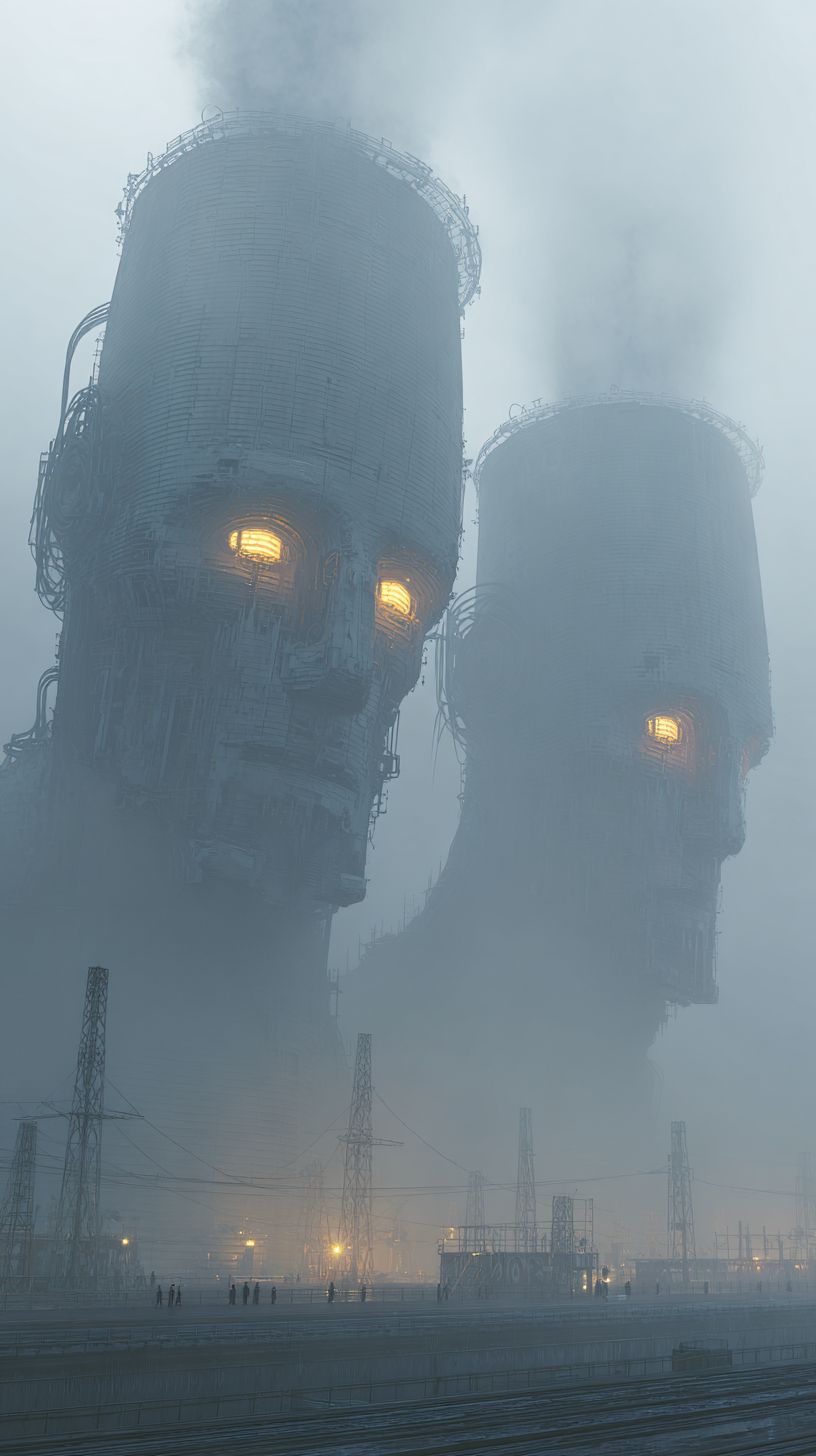 Faces robóticas gigantes embutidas em torres de resfriamento de uma usina em decadência, com olhos brilhando levemente na neblina