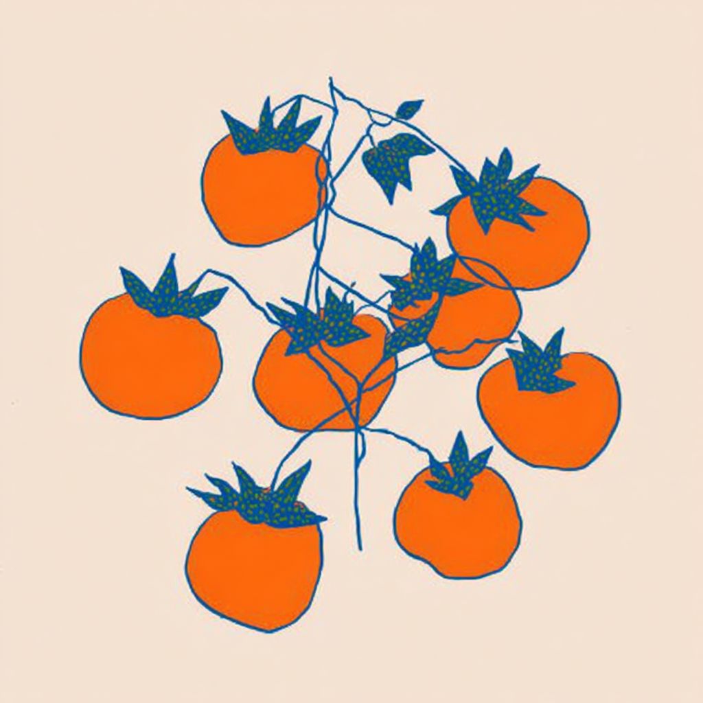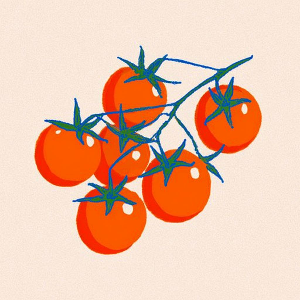 Esta ilustração retrata uma videira de tomate verde com oito tomates vermelhos vibrantes. Os tomates são perfeitamente redondos, com superfícies lisas e brilhantes que parecem recém-lacadas. Cada tomate apresenta cálice verde em forma de estrela em seu topo. A videira se estende diagonalmente do canto superior direito para o inferior esquerdo, com os tomates dispostos em diferentes pontos ao longo de seu comprimento em um padrão esteticamente equilibrado. O fundo é de um suave rosa claro, criando uma atmosfera quente e gentil. Essa cor contrasta fortemente com os tomates vermelhos e a videira verde, fazendo os tomates se destacarem ainda mais. A ilustração adota um estilo limpo e vibrante, com linhas fluidas e cores vívidas, livres de detalhes desnecessários. O efeito geral é fresco, encantador e cheio de fantasia infantil.