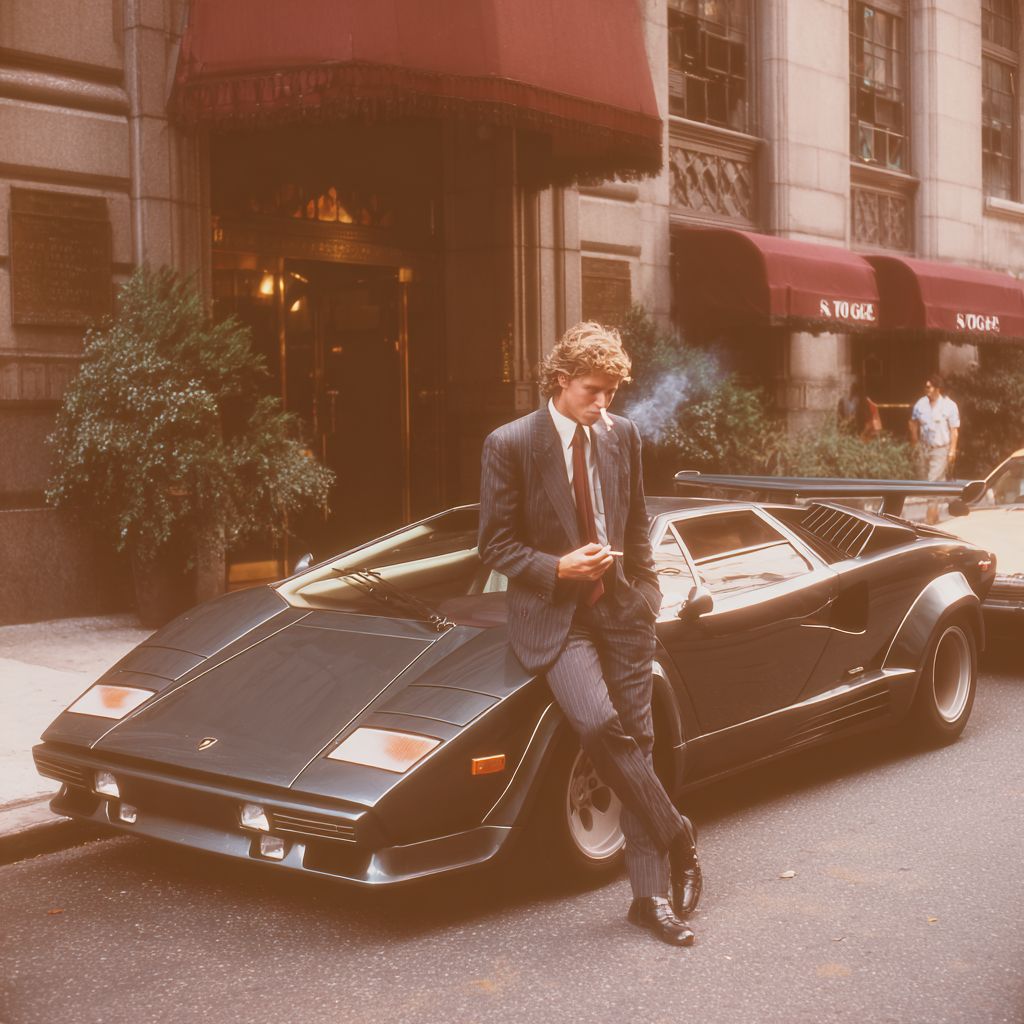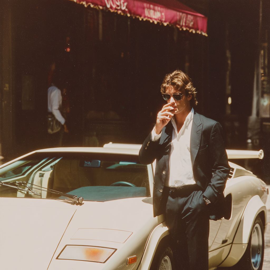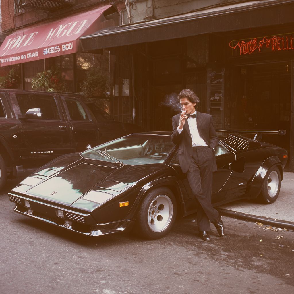 typical 80s goodlooking rich man steps out of his 1980s Lamborghini countach in New York. Vogue editor magazine look a like shot with 80s vibes. Man is smoking a cigarette. Kodak shot --v 7.0