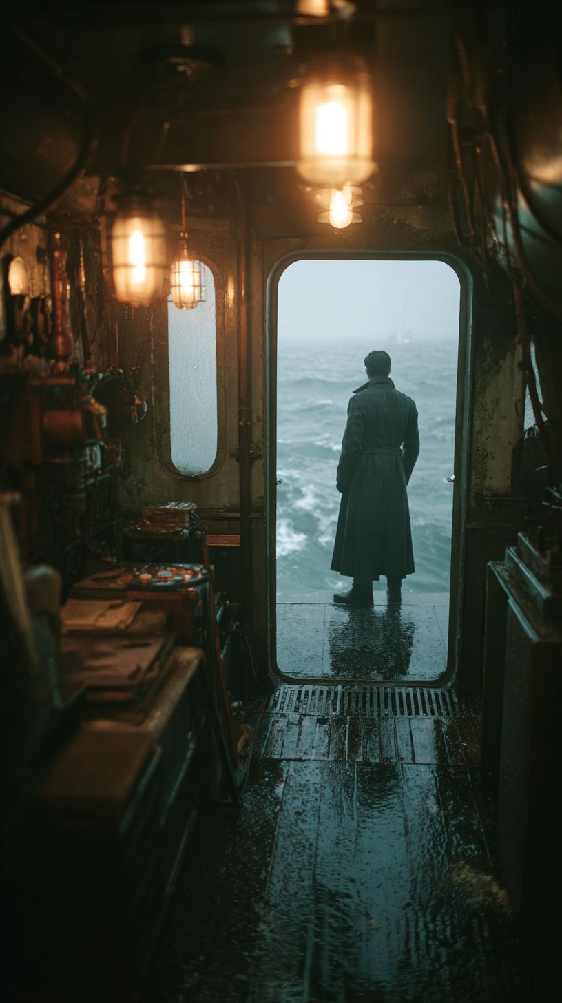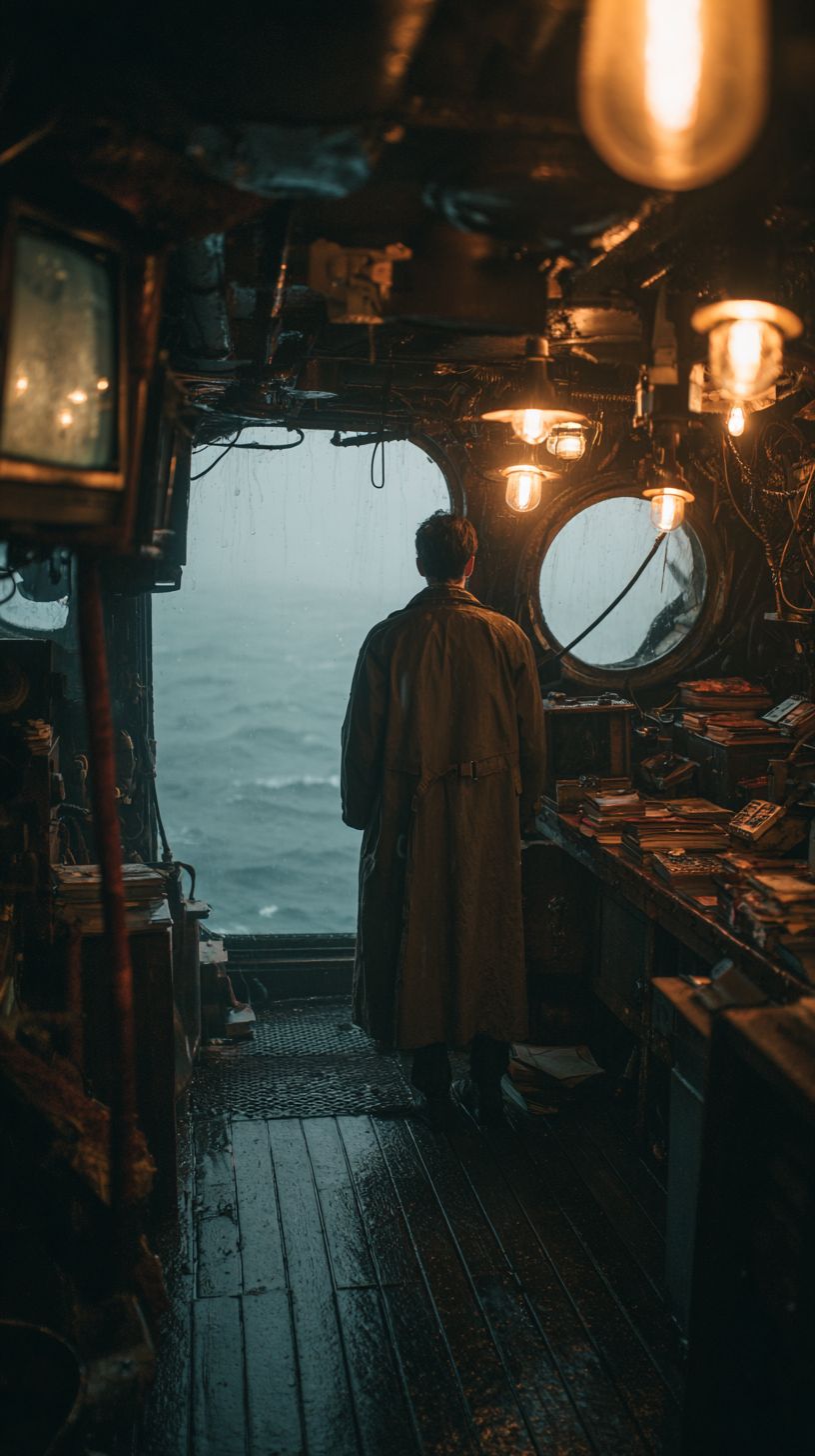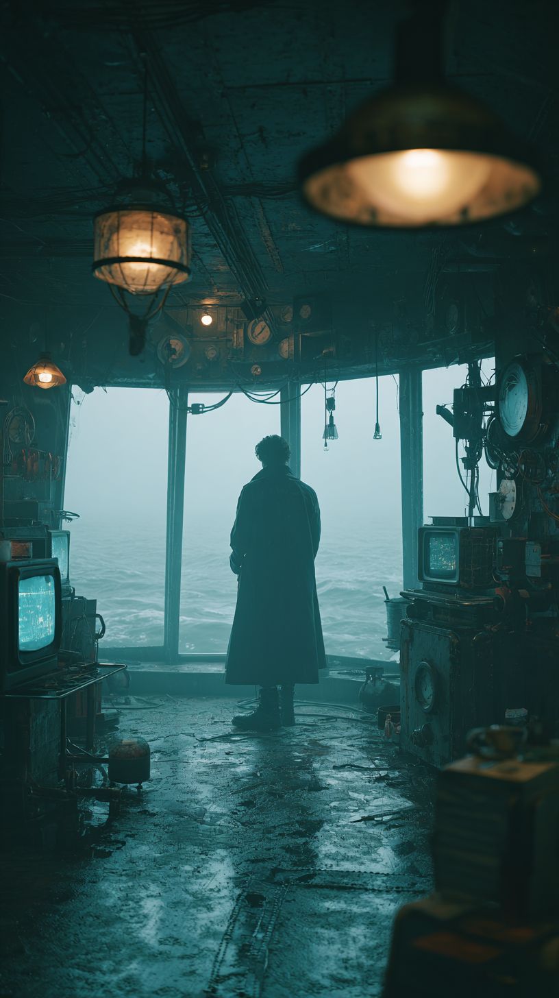 a person in a long soaked trench coat stands within a derelict lighthouse interior filled with rusted machinery, nautical maps, and stacks of film reels. flickering CRT screens and oil lamps light the scene, rain leaks through a cracked window revealing a stormy sea beyond. subtle mist catches the light, revealing fine water droplets suspended midair. captured on a Canon EOS R5, 35mm lens at f/4, ISO 400, 1/60s, white balance 3600K, handheld with stabilized shot, primary subject sharp, background softly diffused by fog. lighting: mixed tungsten and cyan from monitor glow, soft bounce from wet surfaces. Kodak Vision3 500T film emulation, heavy grain in shadows, halation on lamp edges, accurate reflective highlights on metal and glass. muted palette of teal, amber, and gray-blue with practical light realism. --ar 9:16 --v 7.0