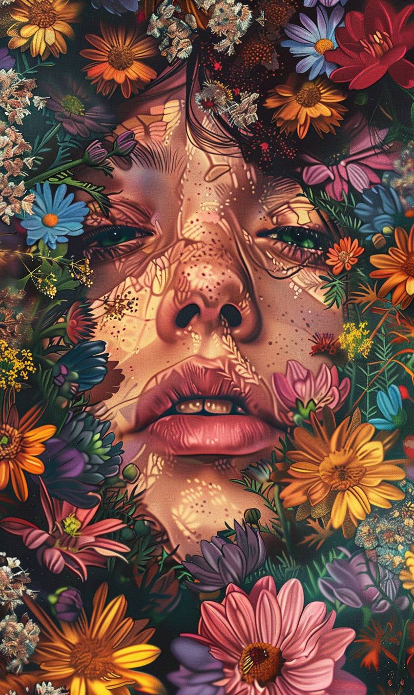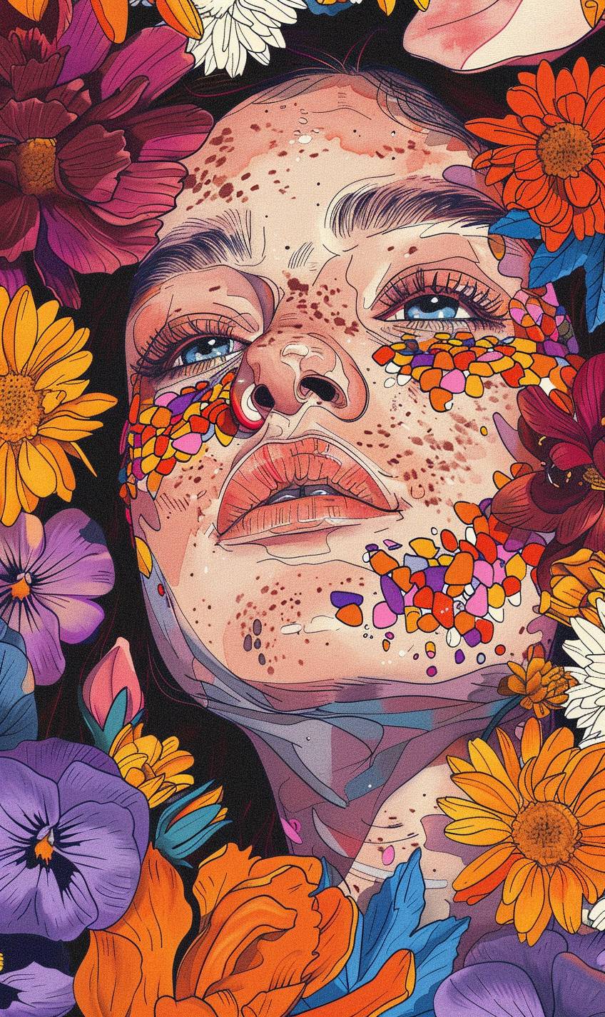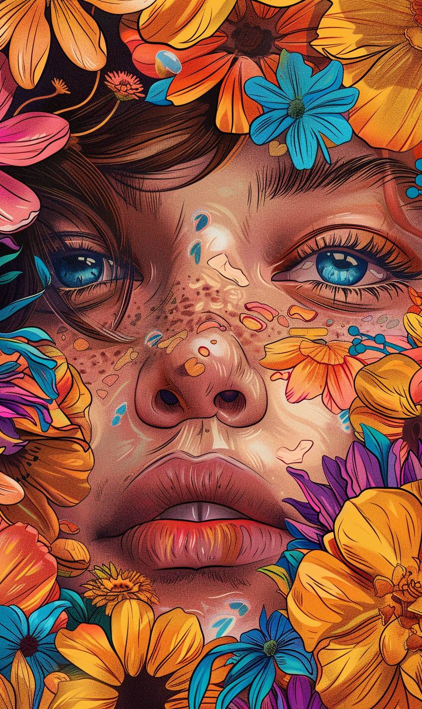 Arte de parede em estilo boho, close-up do rosto do sujeito, cercado por flores coloridas, estética hippie, ilustração digital.