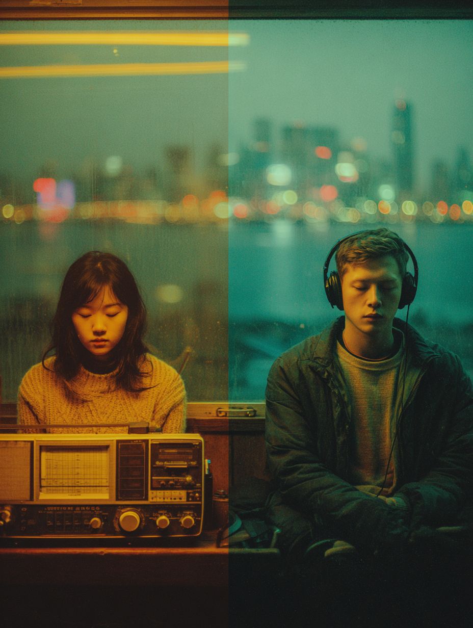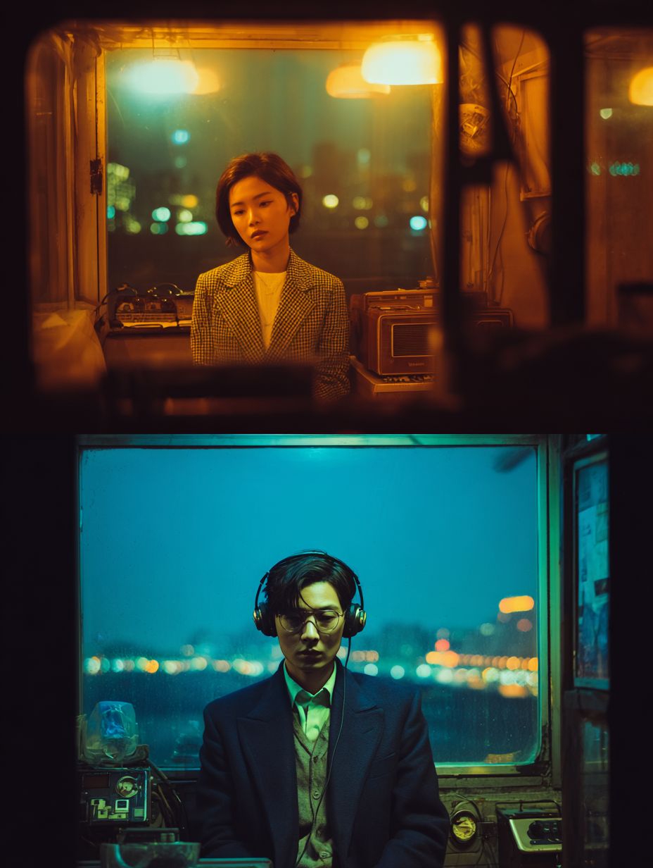 Uma foto cinematográfica, composição dividida mostrando duas pessoas jovens coreanas separadas pelo tempo. À esquerda, uma jovem coreana, sentada ao lado de um pequeno rádio em seu apartamento escuro de um cômodo, luz amarela quente, atmosfera vintage de Seul dos anos 90. À direita, um jovem coreano, sentado em uma cabine de rádio moderna à noite, luz fluorescente azul, fones de ouvido ao redor do pescoço. Entre eles: o horizonte da cidade invernal e uma fraca frequência de rádio brilhante conectando ambos os lados. O clima é melancólico, nostálgico, romântico, com iluminação cinematográfica suave, profundidade de campo rasa, contraste entre quente e frio.