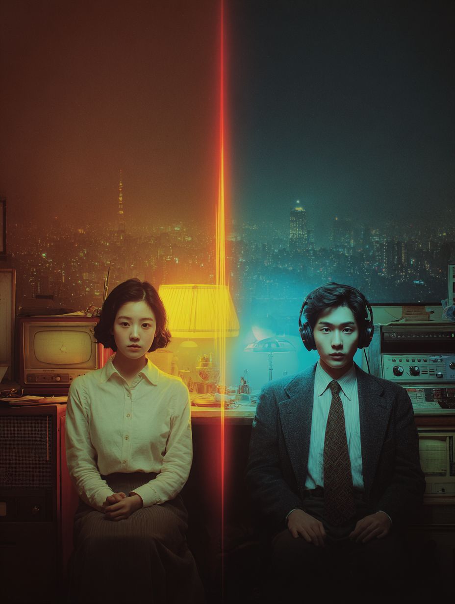 A cinematic photo, Split composition showing two young korean people separated by time. On the left, a young korean woman, sitting beside a small radio in her dim one-room apartment, warm yellow light, vintage 90s Seoul atmosphere. On the right, a young korean man, sitting in a modern radio booth at night, blue fluorescent light, headphones around his neck. Between them: the winter city skyline and a faint glowing radio frequency connecting both sides. Mood is melancholic, nostalgic, romantic soft cinematic lighting, shallow depth of field, warm and cool contrast, --chaos 15 --ar 3:4 --raw --v 7.0